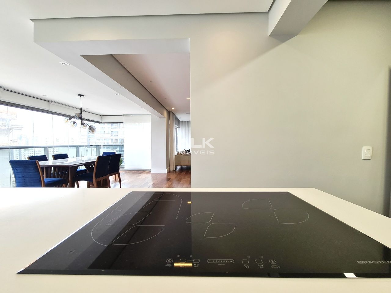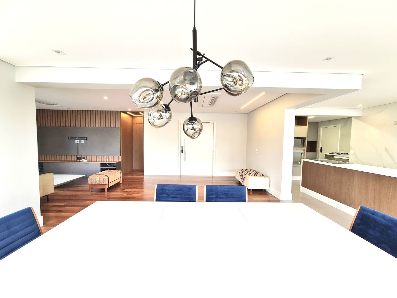 A varanda foi completamente integrada a sala promovendo 3 excelentes ambientes de estar, jantar e TV.