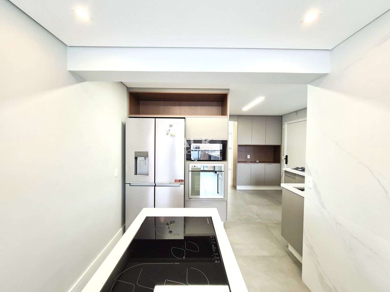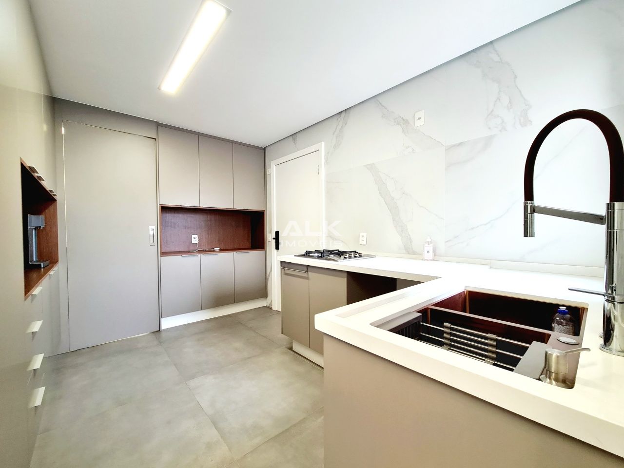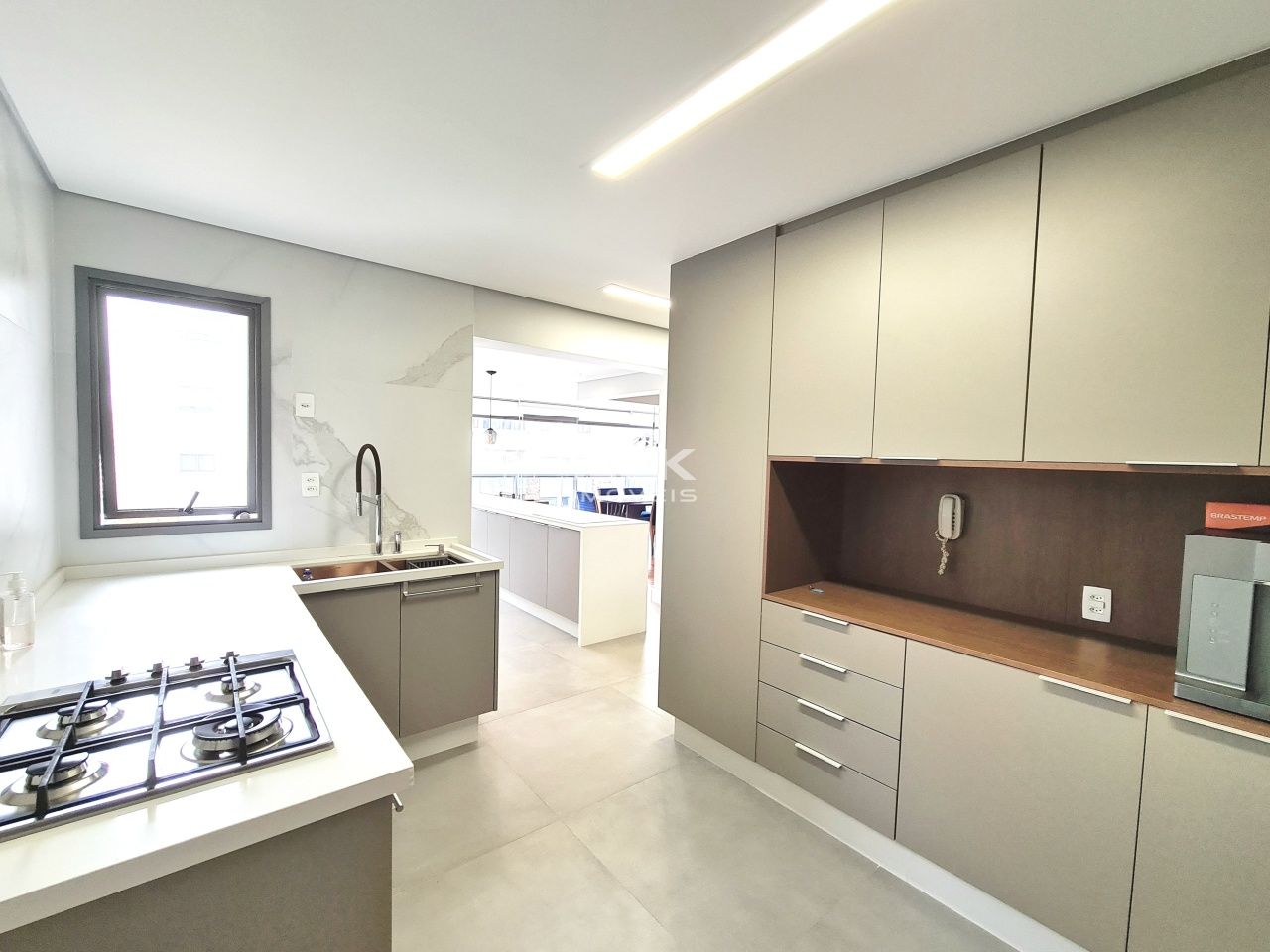 Neste projeto a cozinha da casa, do dia a dia, possui conexão com a cozinha gourmet de forma muito harmônica e funcional.