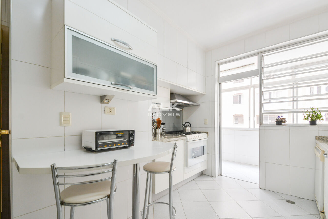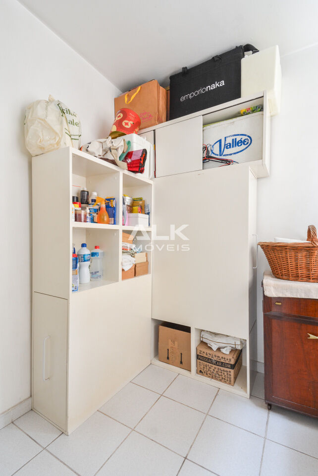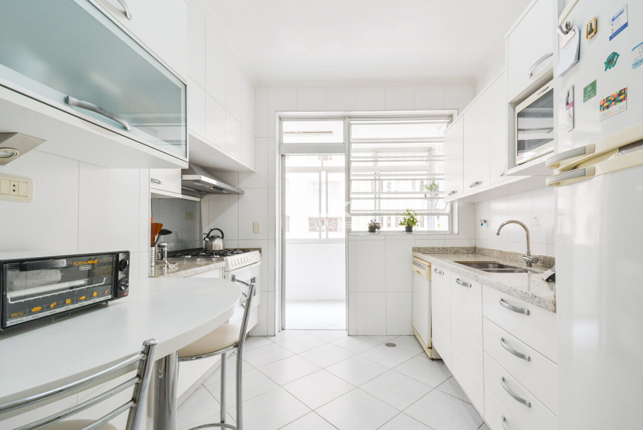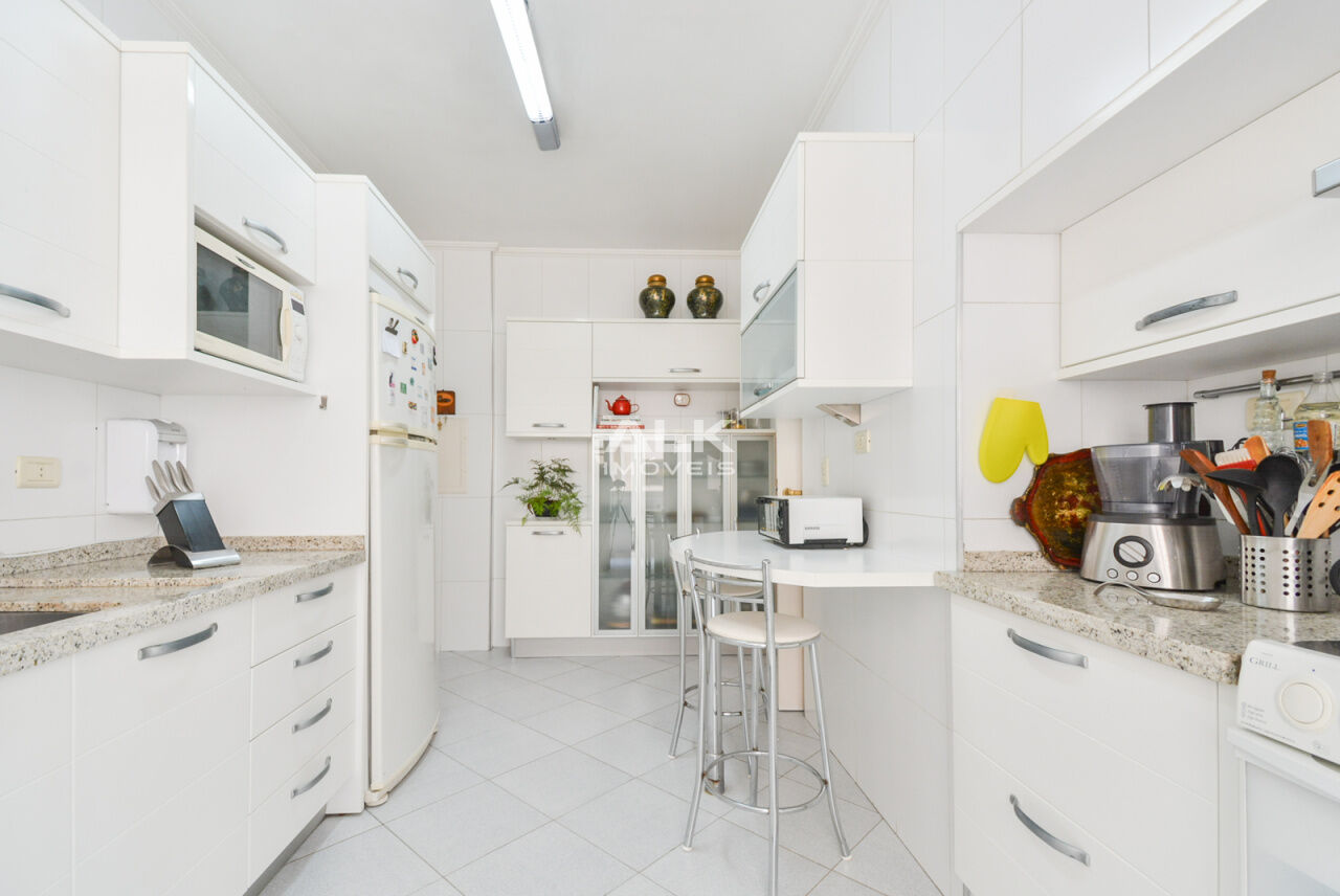 A cozinha e a copa estão equipadas com armários feitos sob medida, dividas de acordo com sua funcionalidade. A área de serviço é espaçosa e bem ventilada, e ainda conta com um pequeno quarto e banheiro de serviço.