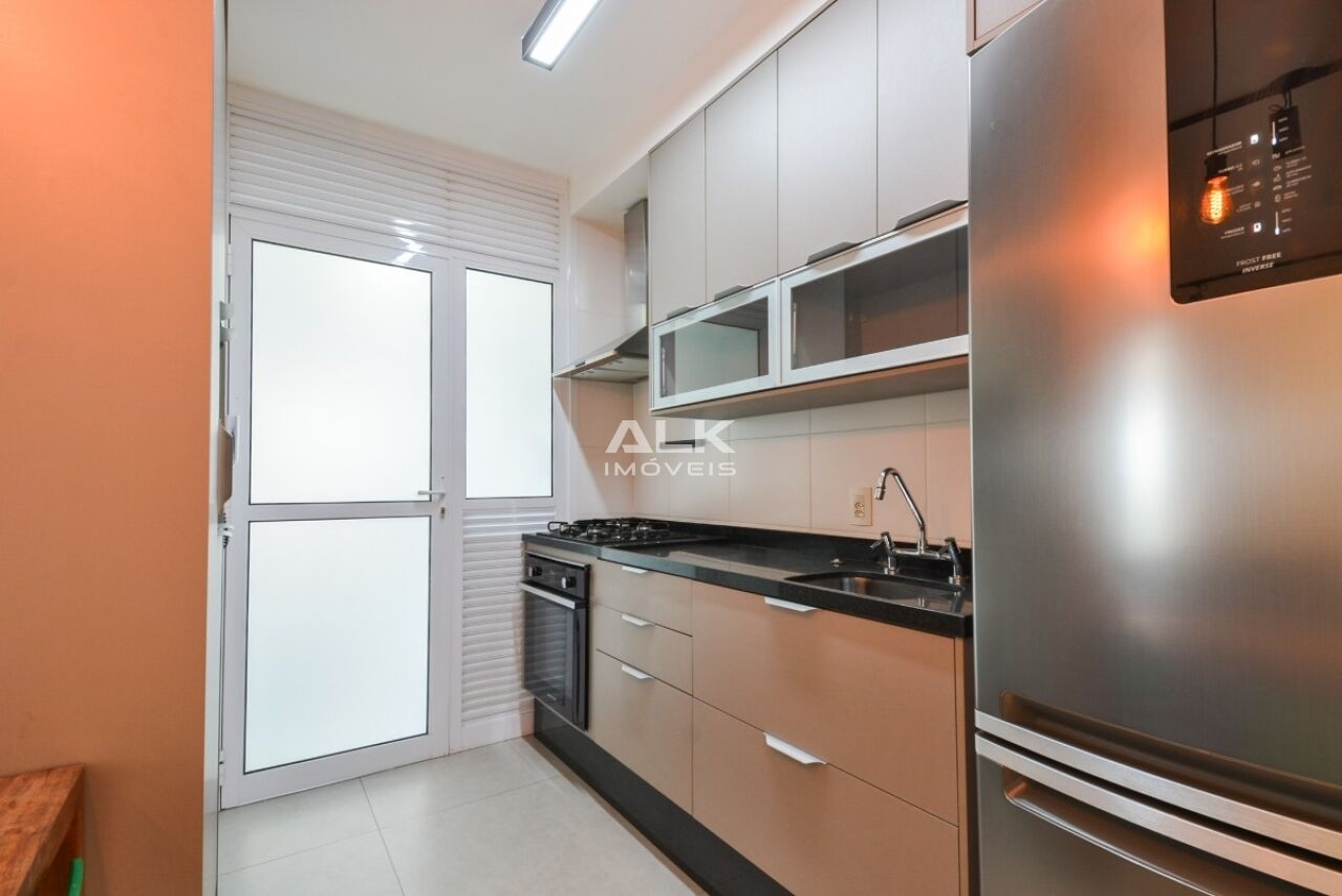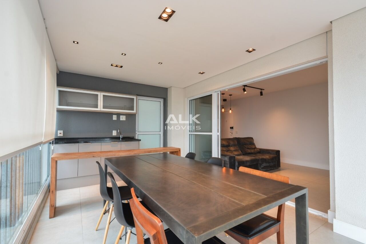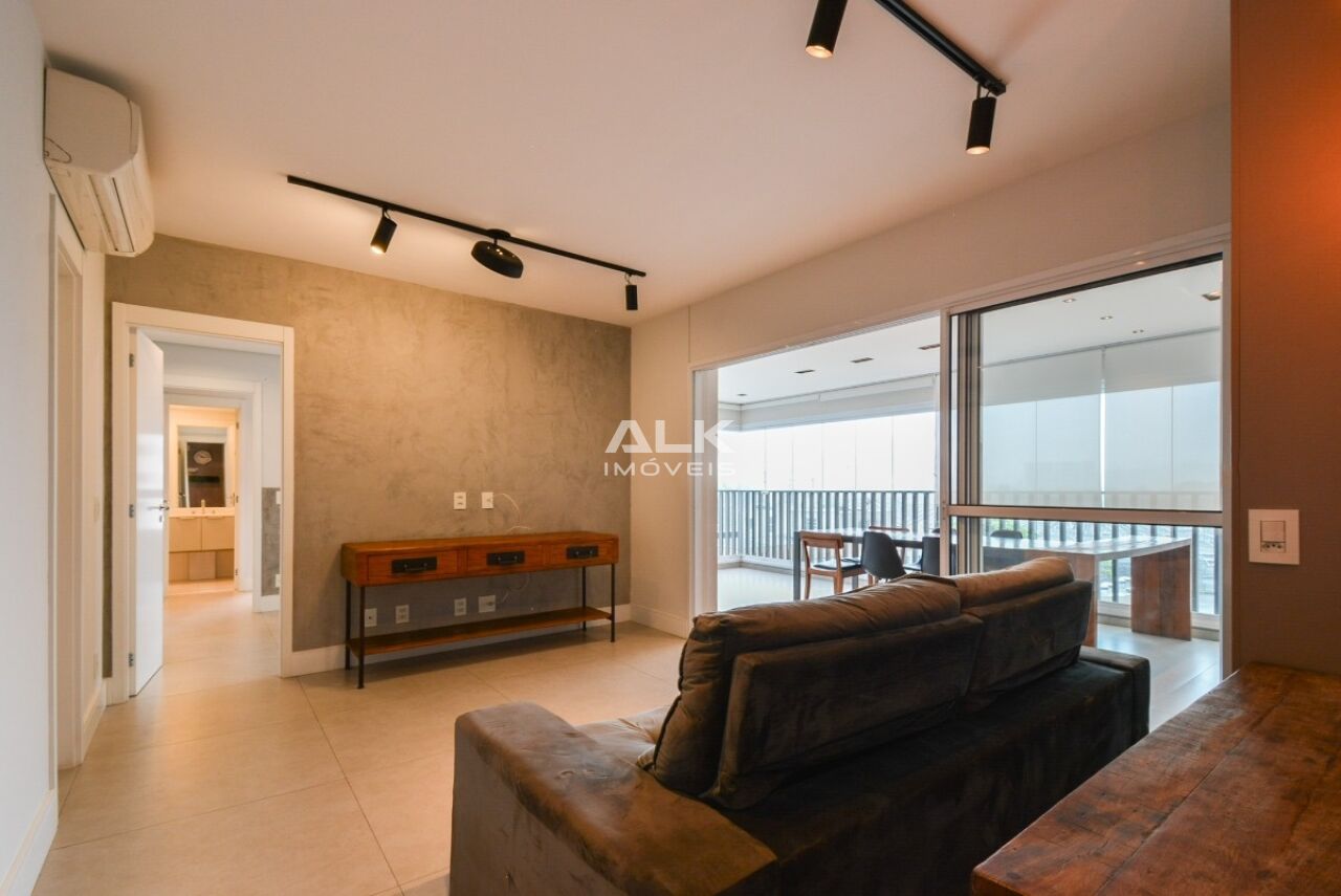Living para 2 amplos ambientes com varanda gourmet integrada e envidraçada, lavabo, cozinha americana e área de serviço isolada, com área técnica para as condensadoras do ar-condicionado.
