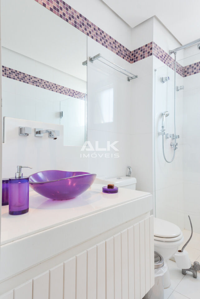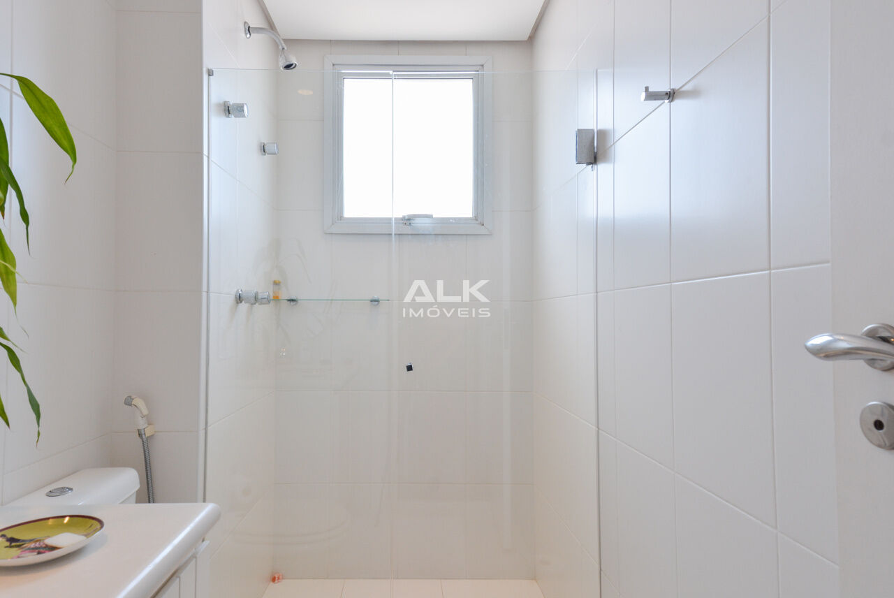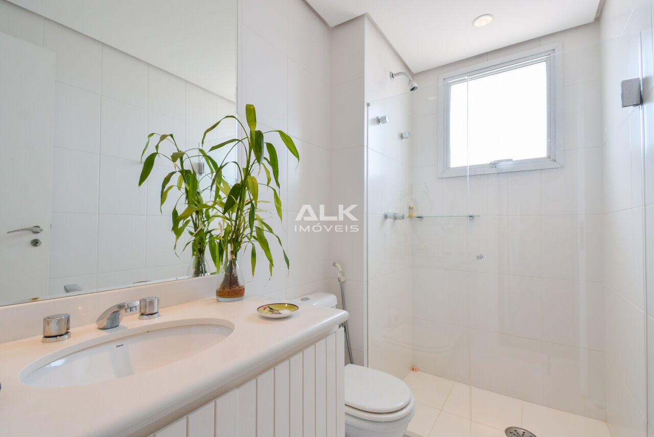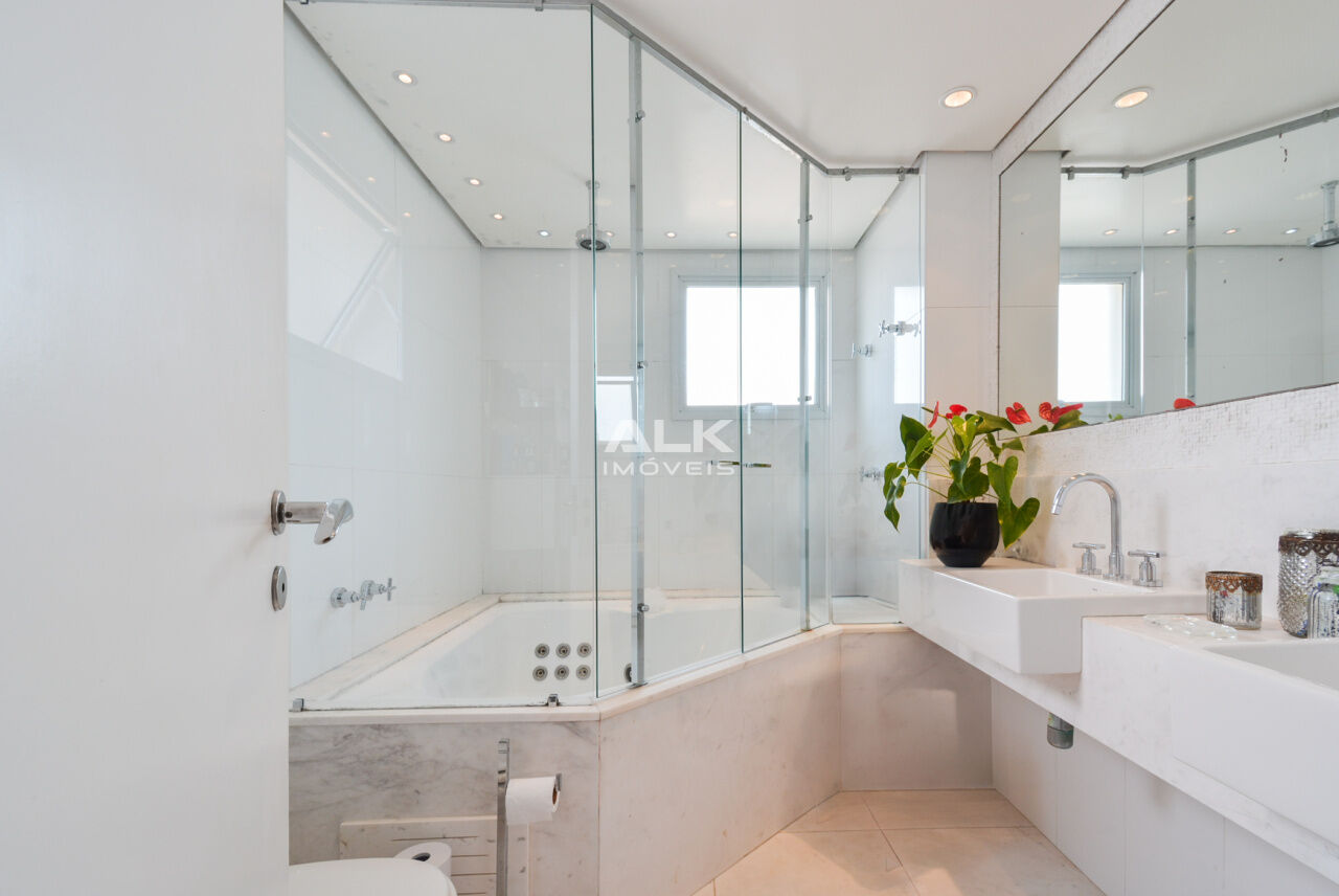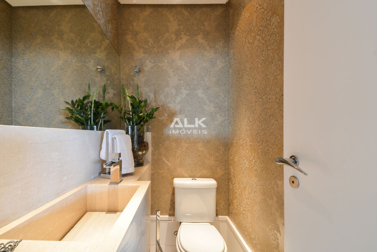 5 banheiros no total, sendo 4 suítes e 1 lavabo, com acabamentos de alto padrão.