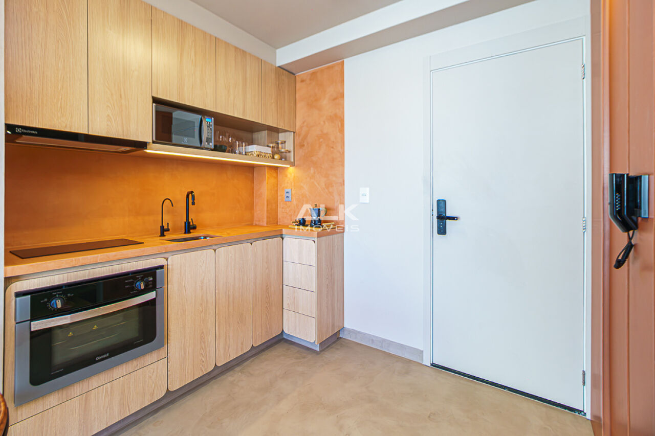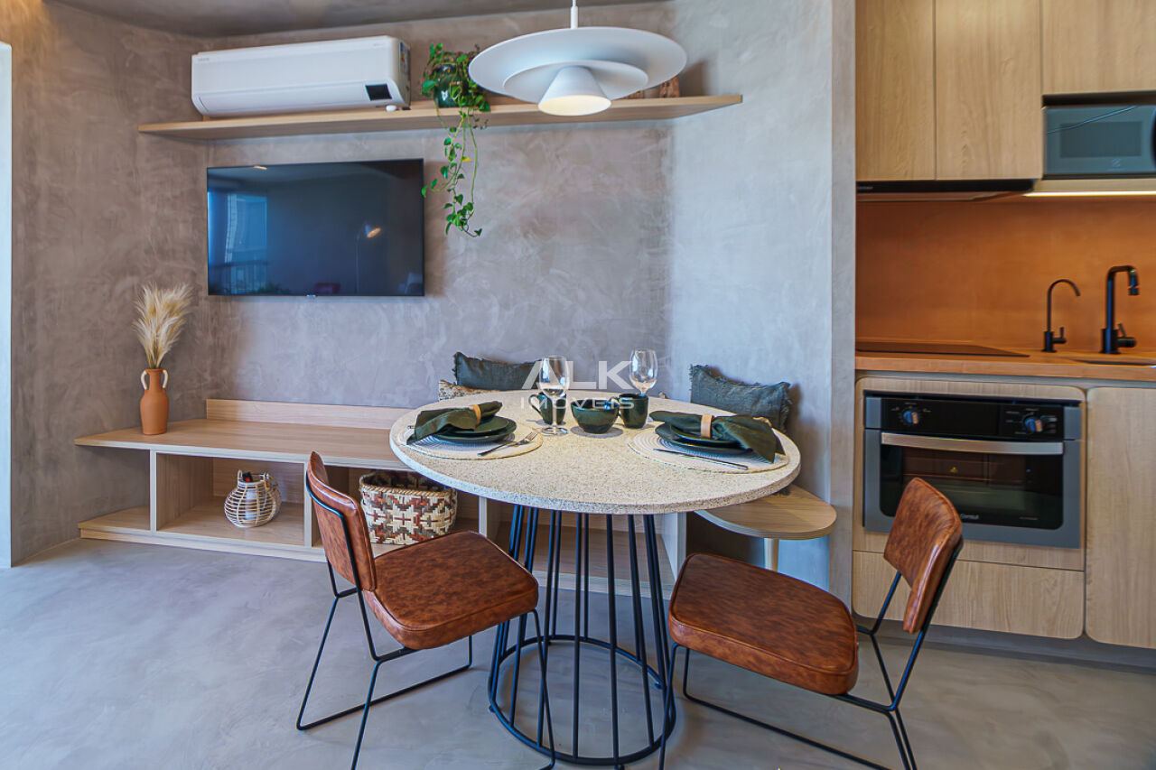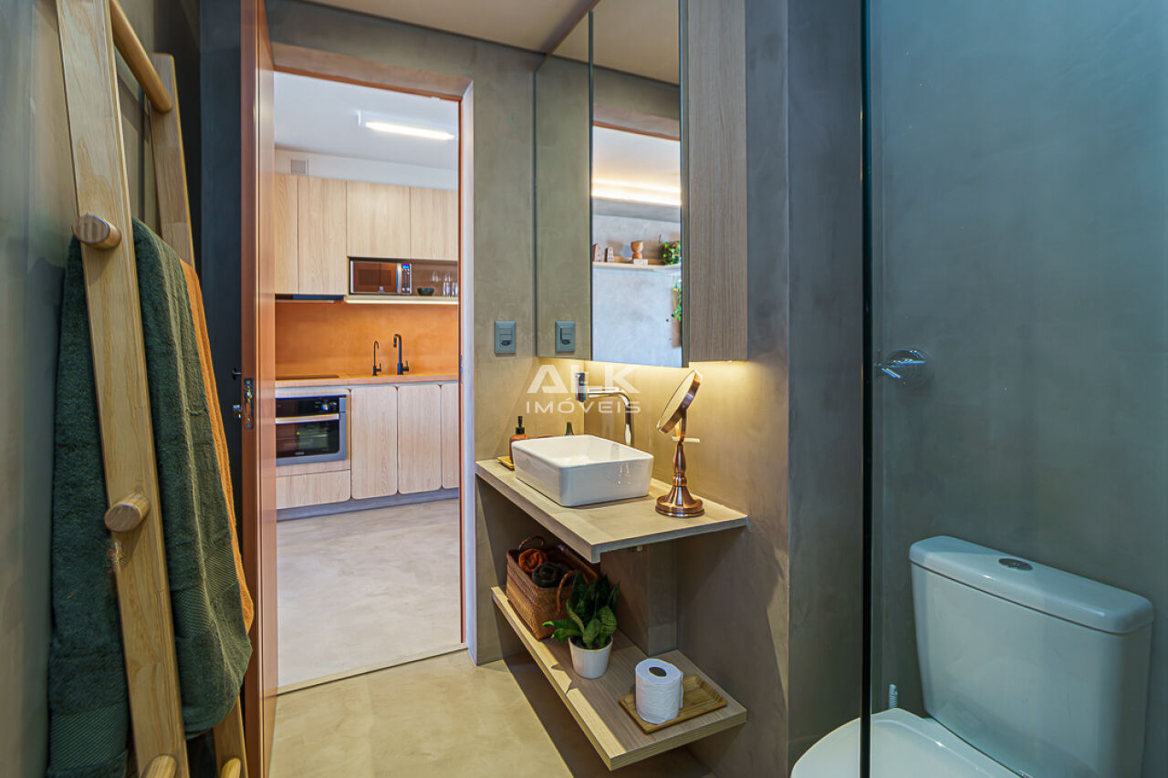 O apartamento impressiona com seus acabamentos de alta qualidade, proporcionando um ambiente elegante e acolhedor. Sua cozinha equipada é perfeita para os amantes da culinária, enquanto o banheiro exibe um design sofisticado. A espaçosa área de estar, integrada ao ambiente, é ideal para relaxar e receber amigos e familiares.