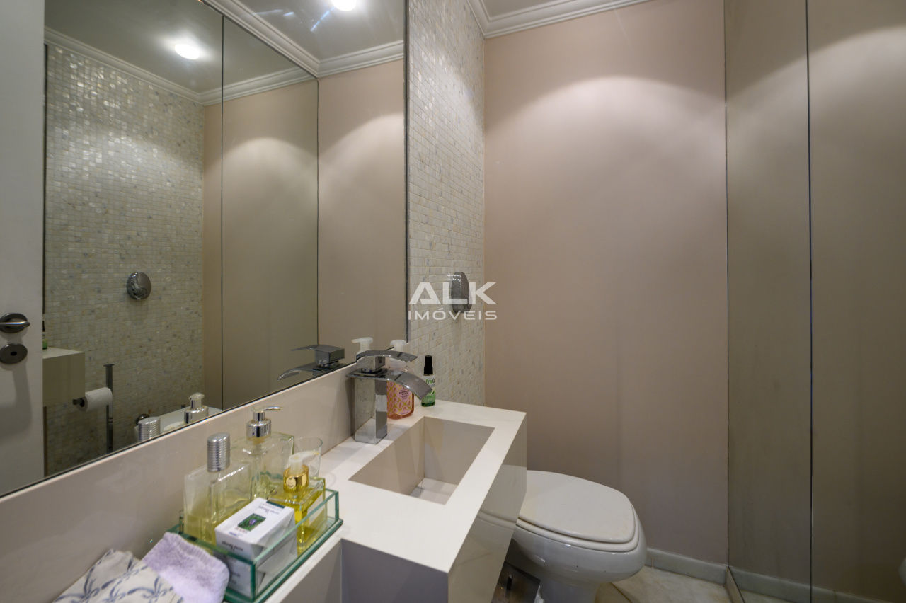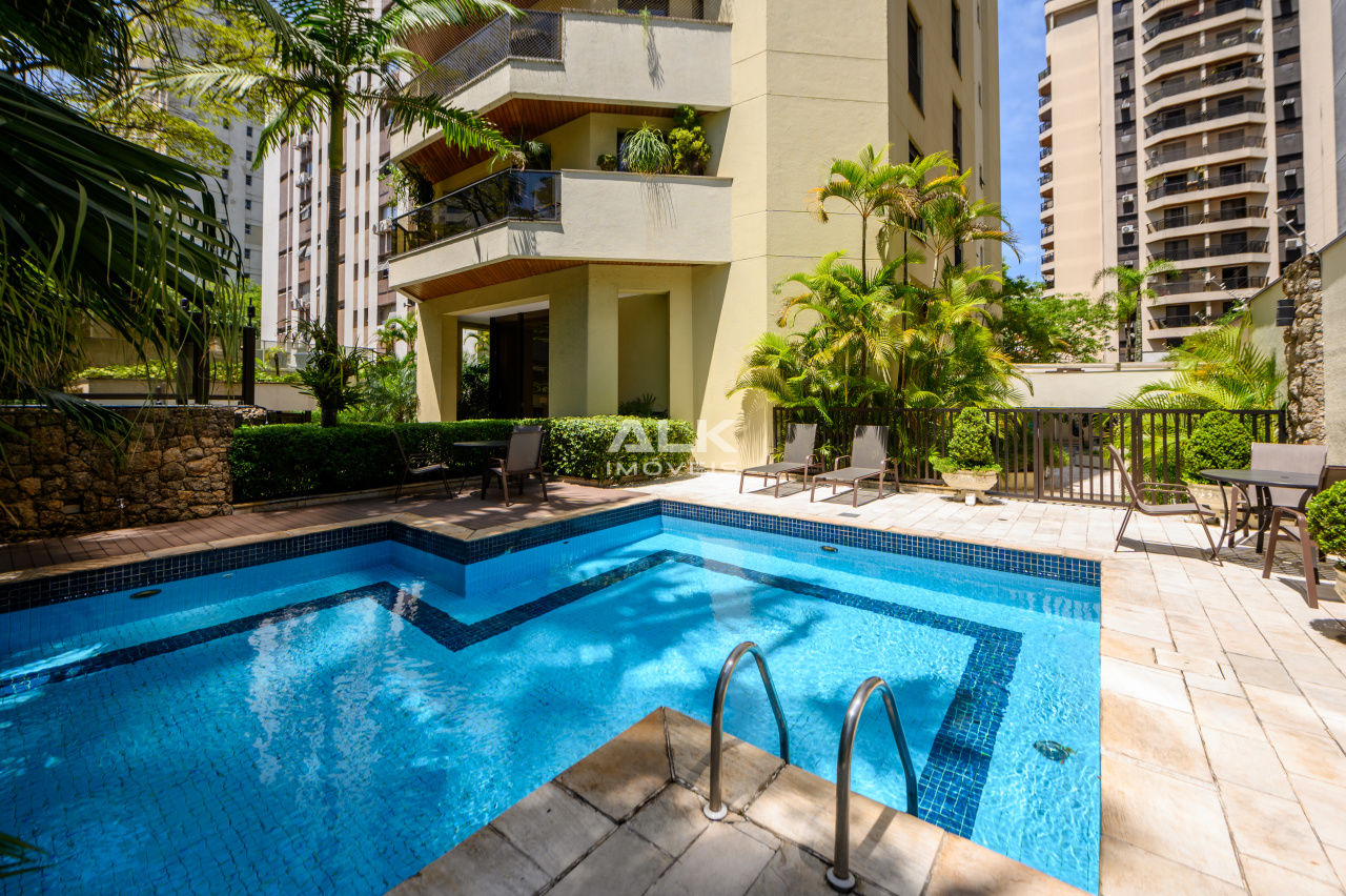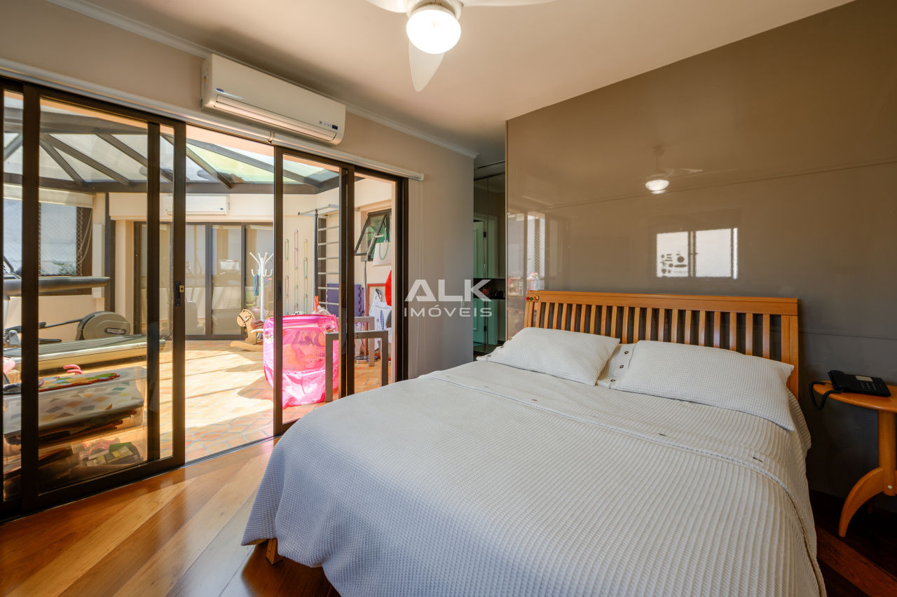 O piso superior conta com piscina, área gourmet e solarium, cozinha de apoio, sala com lareira e bar, local para sauna, duas suítes com varanda ou jardim de inverno, sendo uma delas em uso como escritório.