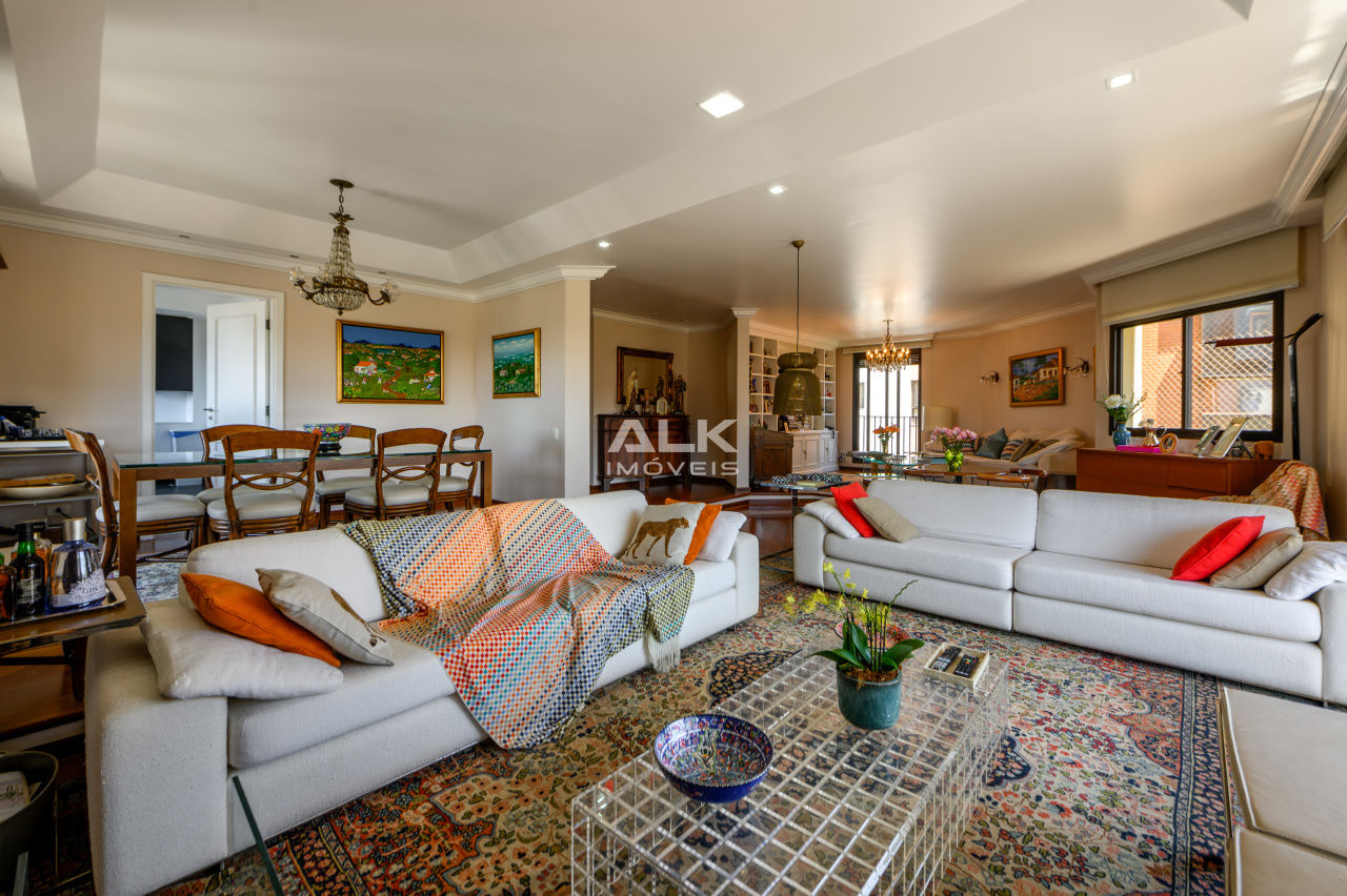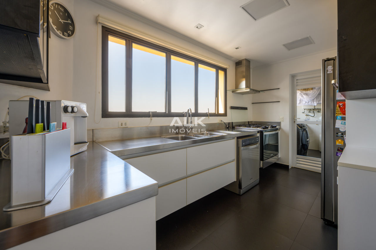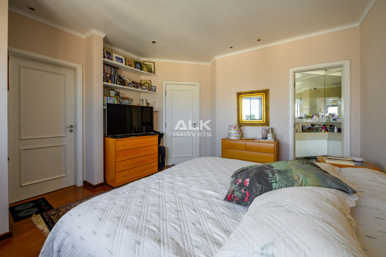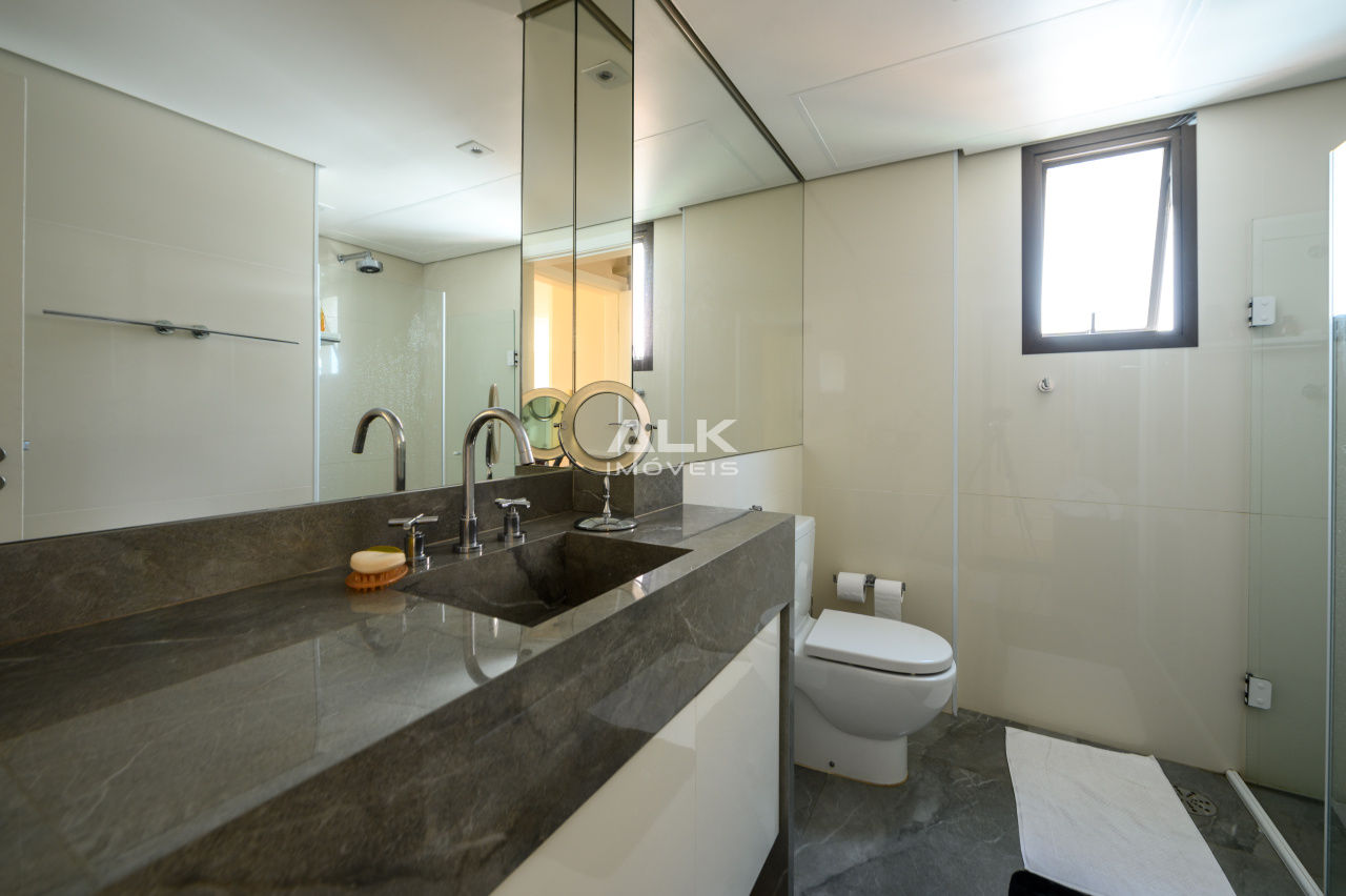 O piso superior conta com piscina, área gourmet e solarium, cozinha de apoio, sala com lareira e bar, local para sauna, duas suítes com varanda ou jardim de inverno, sendo uma delas em uso como escritório.