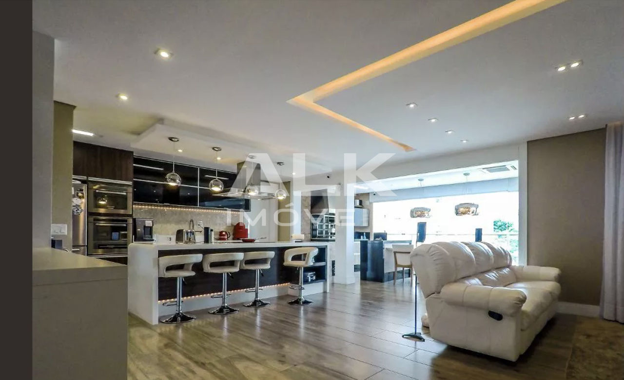 A sala ampla, integrada à varanda gourmet envidraçada, cria um espaço perfeito para receber convidados com charme e conforto. A cozinha é equipada com o que há de melhor, contando com armários planejados da renomada marca Kitchens, unindo design e funcionalidade.