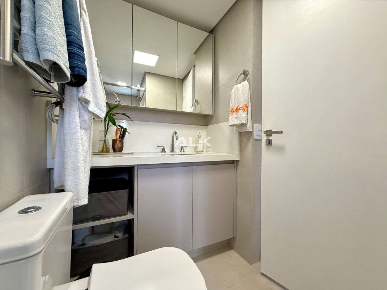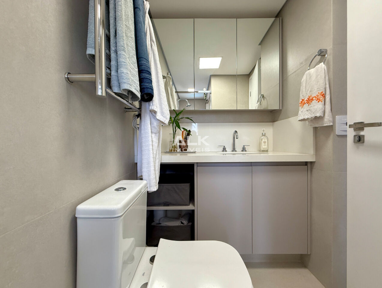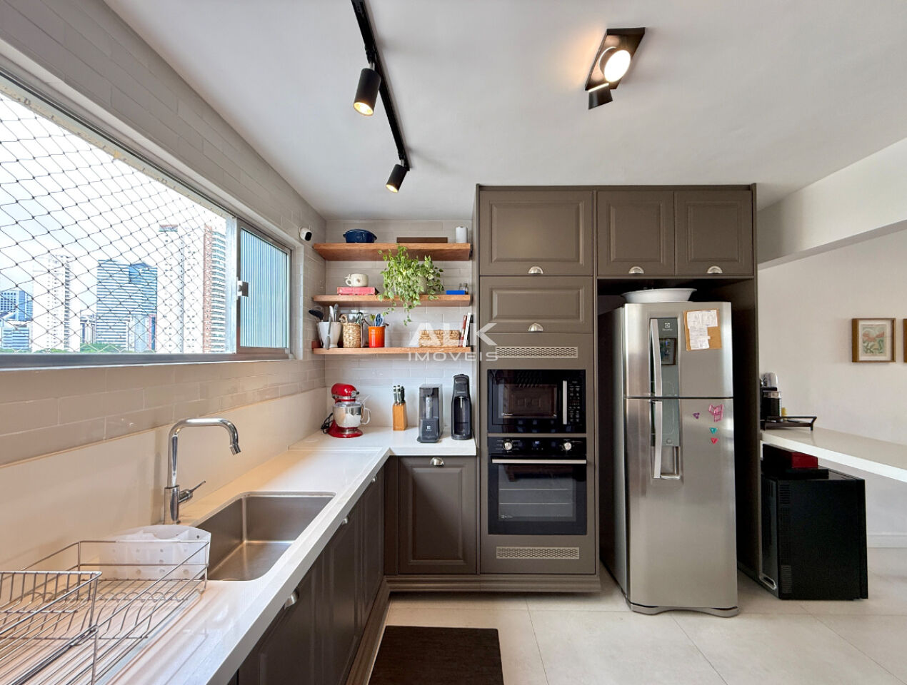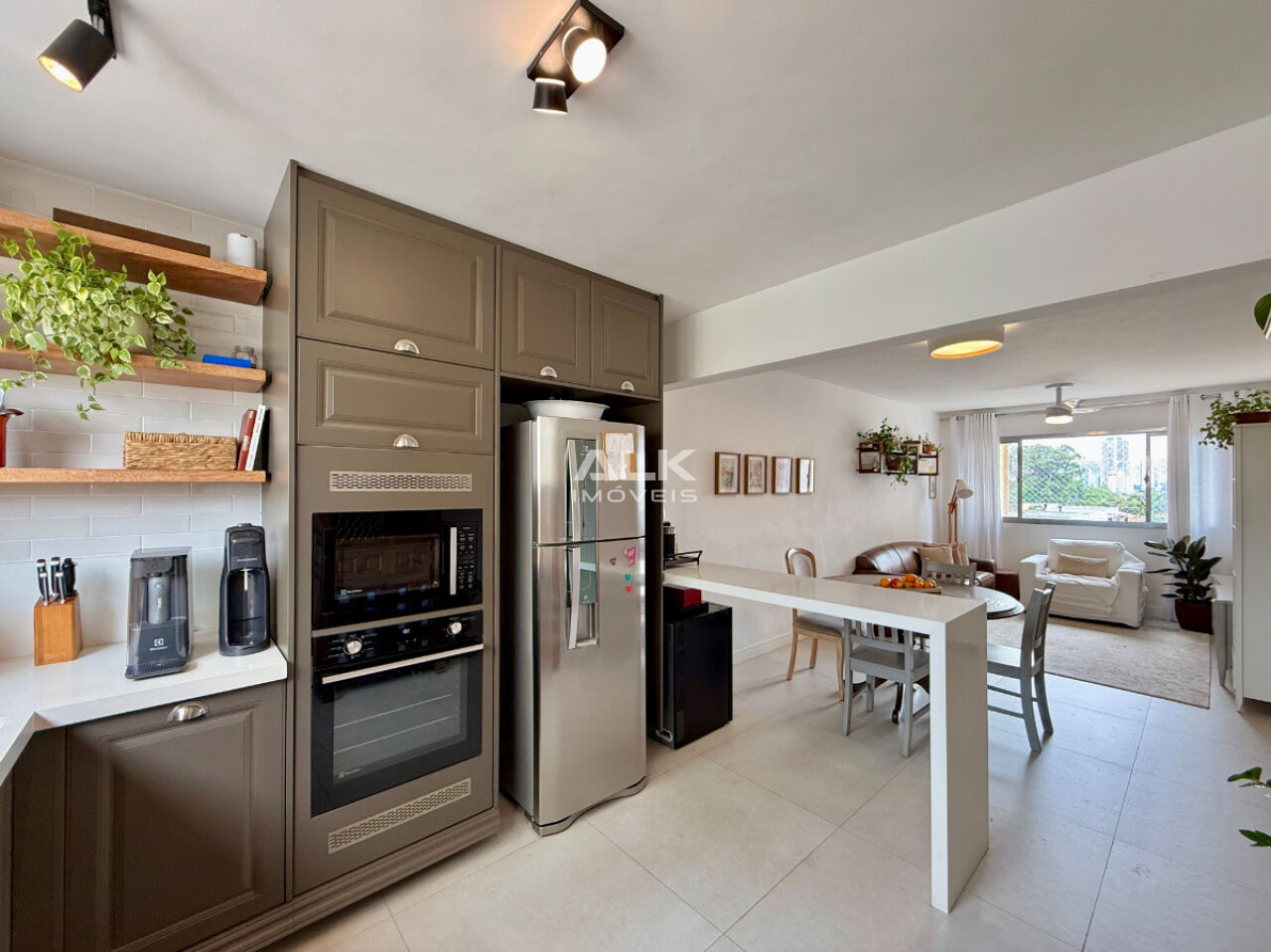 O apartamento conta com uma cozinha integrada, área de serviço e um banheiro de serviço, além de móveis planejados que otimizam o espaço. O piso em porcelanato traz modernidade e facilita a manutenção.