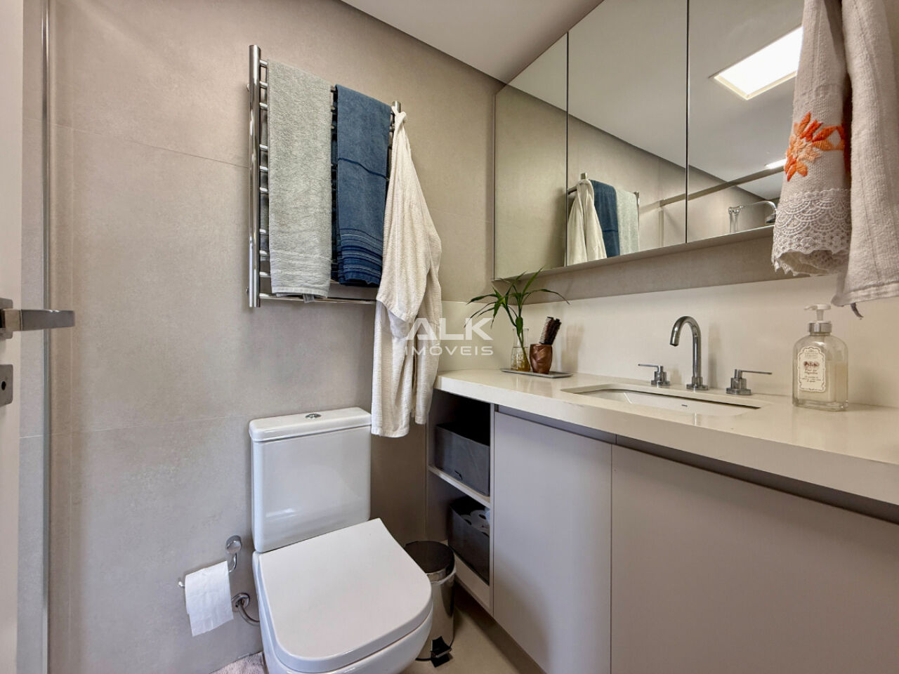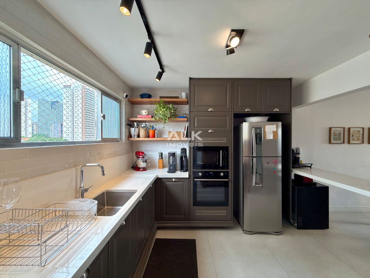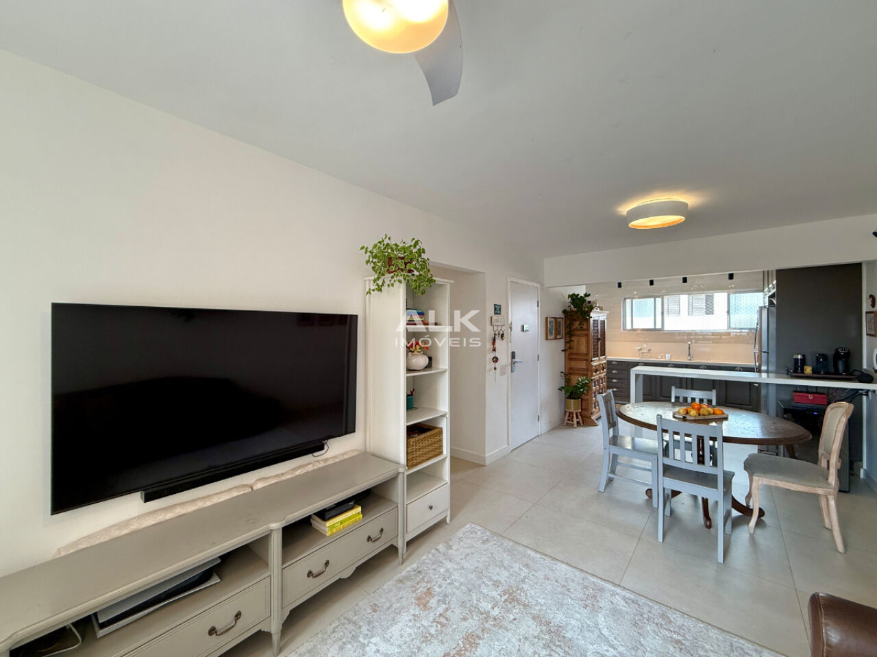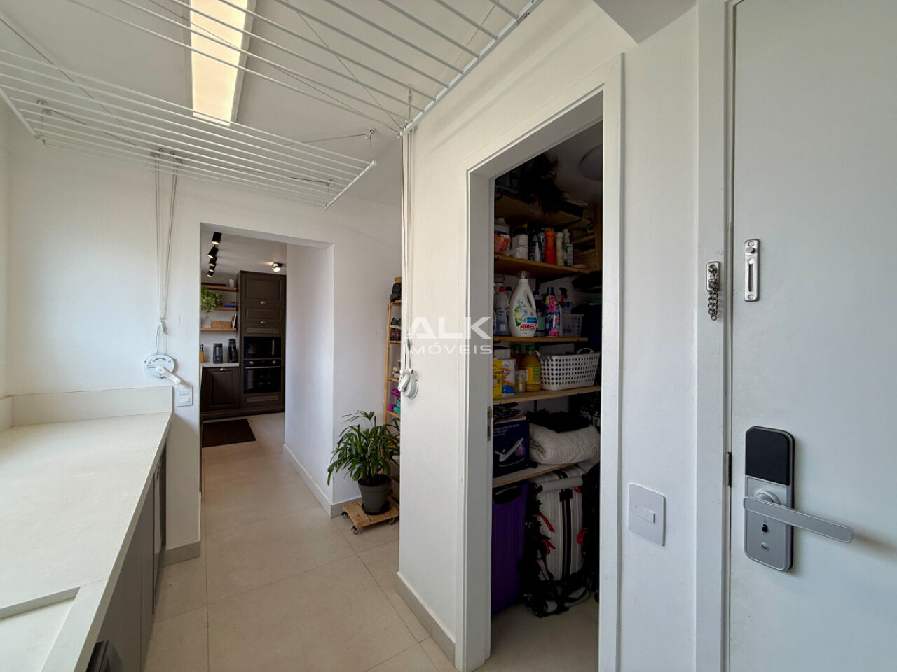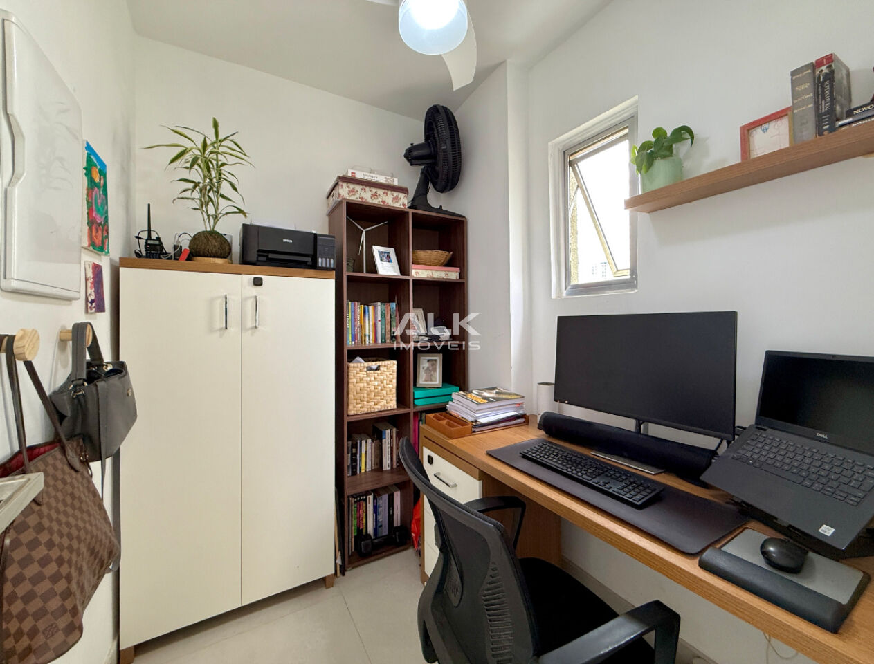 O apartamento conta com uma cozinha integrada, área de serviço e um banheiro de serviço, além de móveis planejados que otimizam o espaço. O piso em porcelanato traz modernidade e facilita a manutenção.