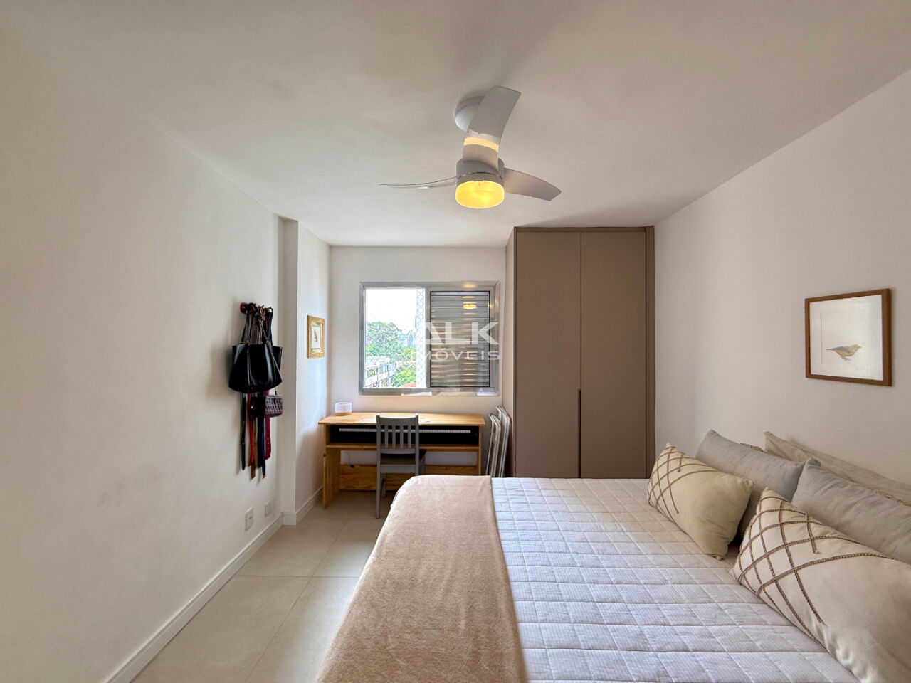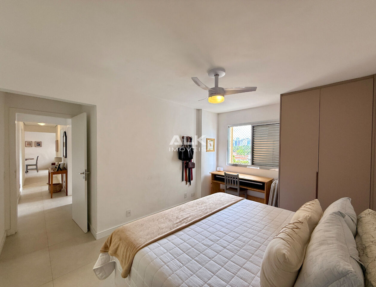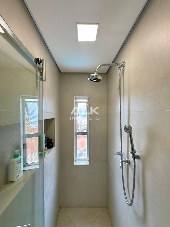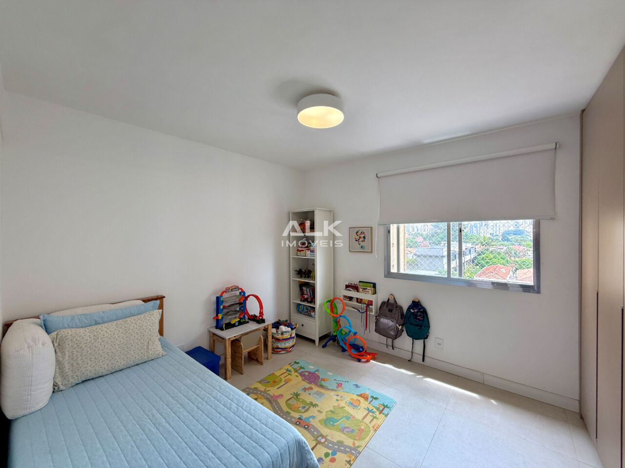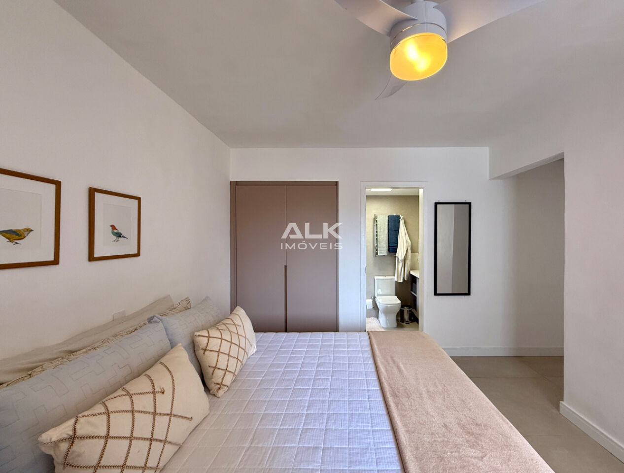 O apartamento conta com uma cozinha integrada, área de serviço e um banheiro de serviço, além de móveis planejados que otimizam o espaço. O piso em porcelanato traz modernidade e facilita a manutenção.