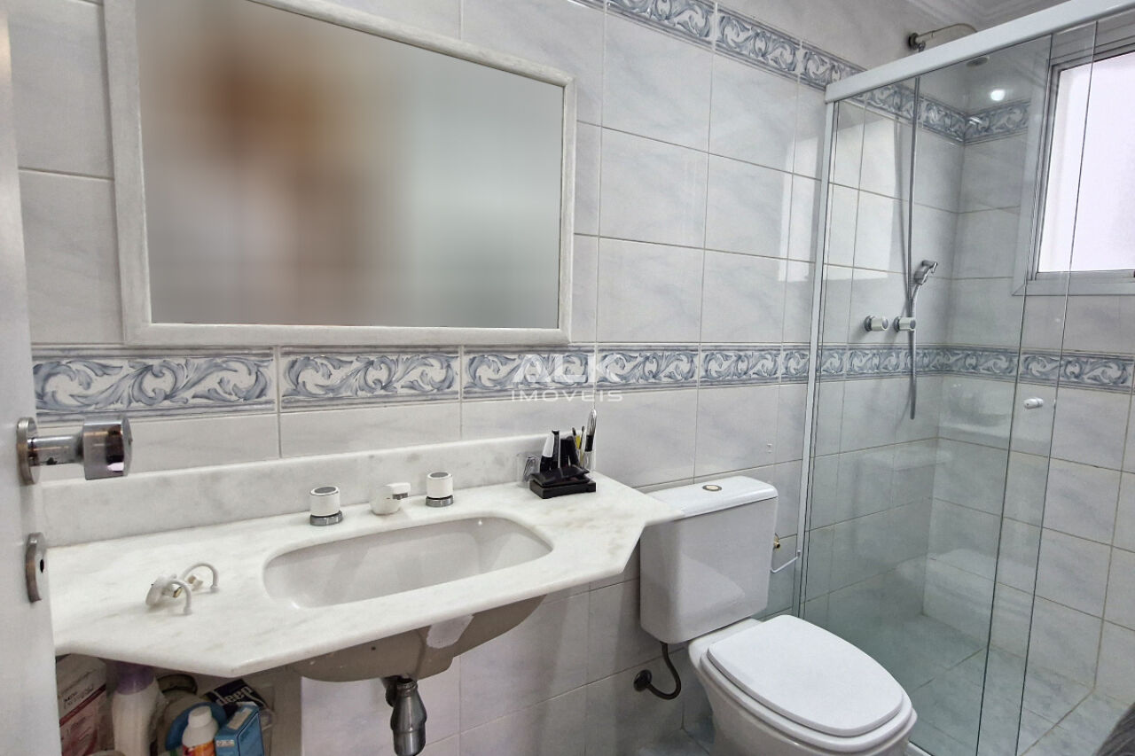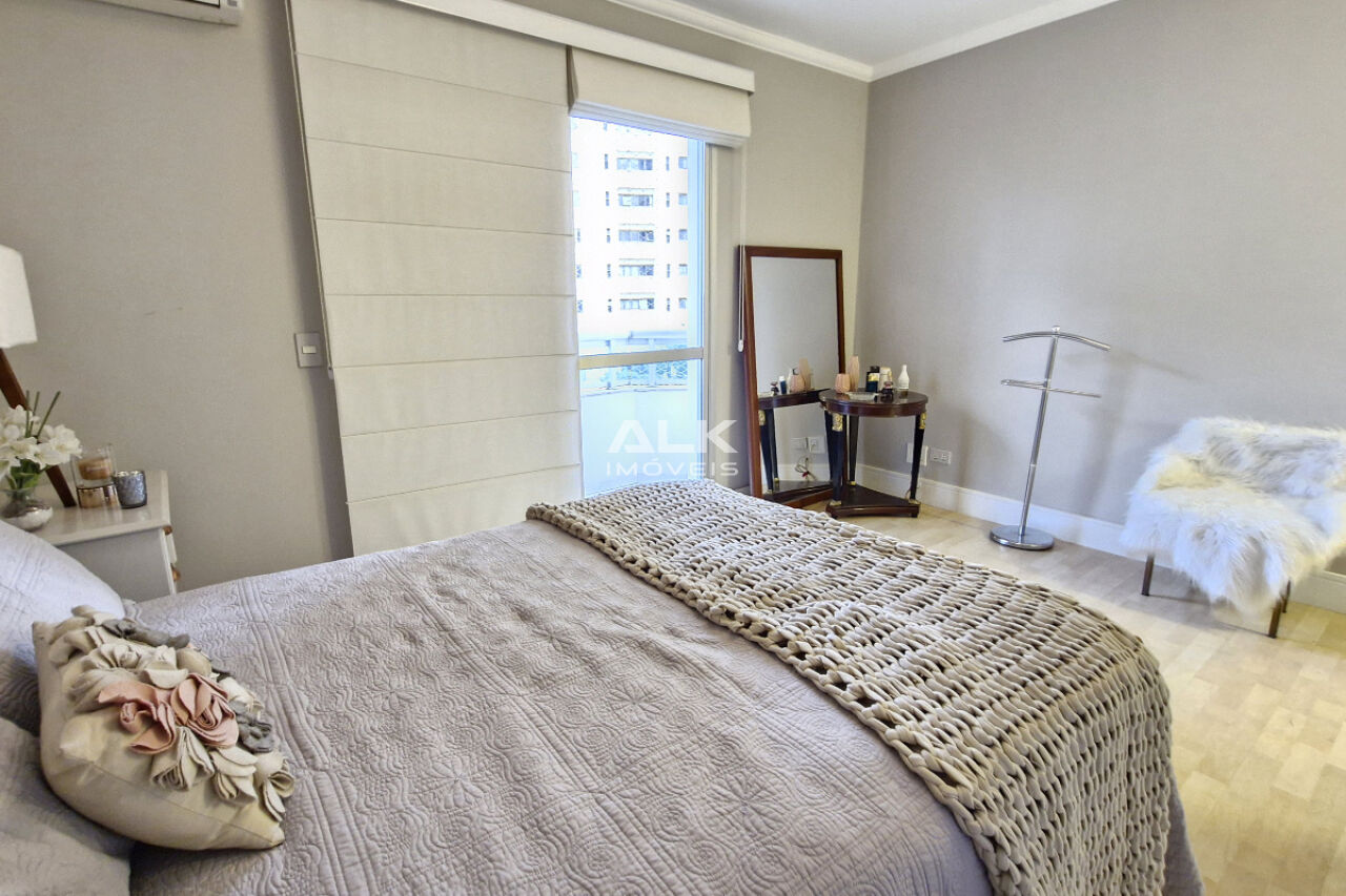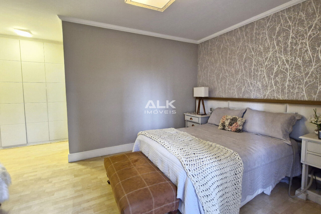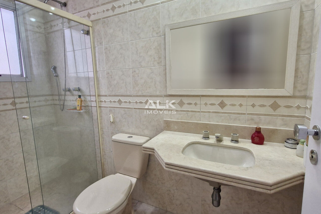 Suíte master de destaque, com banheira, armários embutidos e revestimentos premium.