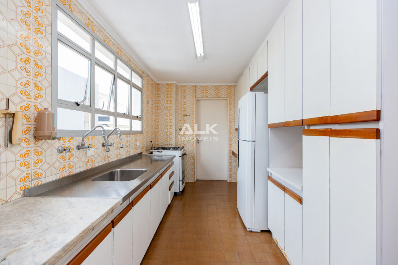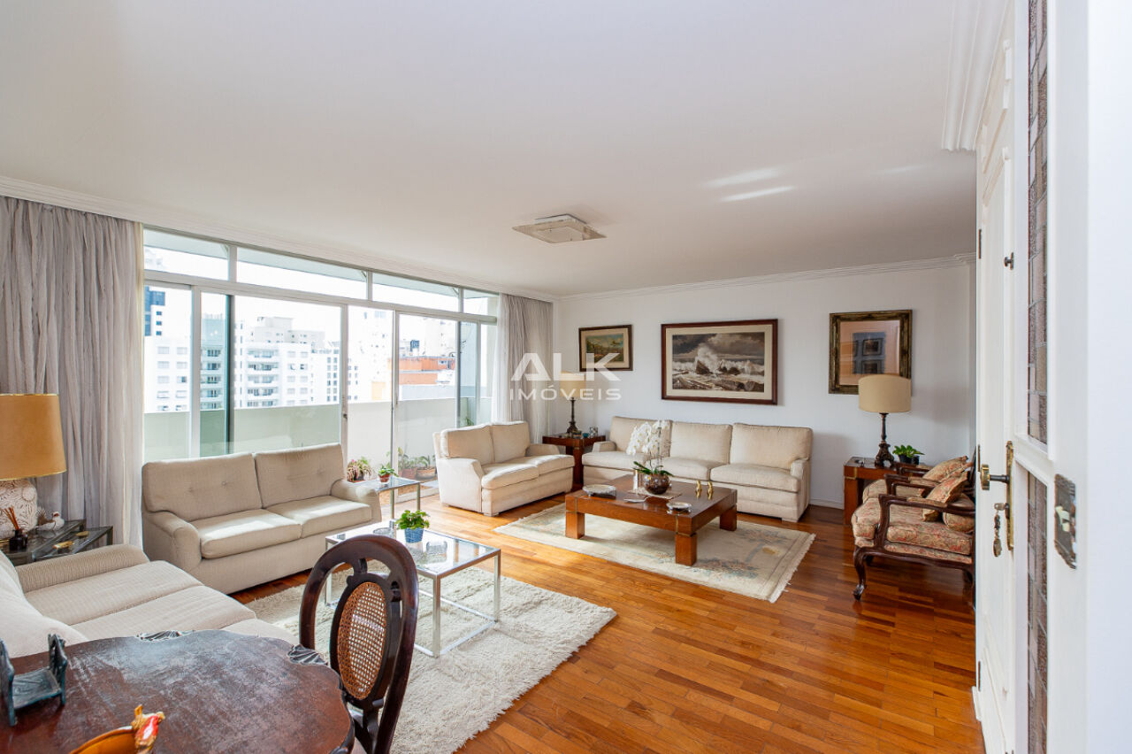 Amplo apartamento com 196m² de área útil, localizado no 15º andar do Condomínio Viviane. Com planta generosa, oferece 4 dormitórios, sendo 1 suíte com closet, além de lavabo e 2 vagas de garagem determinadas e depósito. Os ambientes contam com hall privativo, sacada, piso de madeira, móveis planejados e aquecimento central. Destaque para a dependência de funcionário completa e área de serviço funcional.