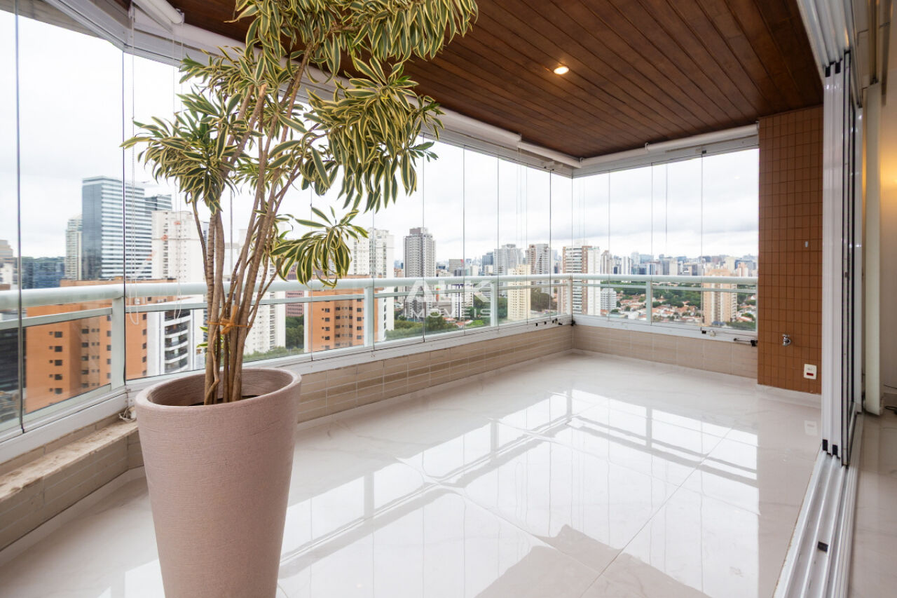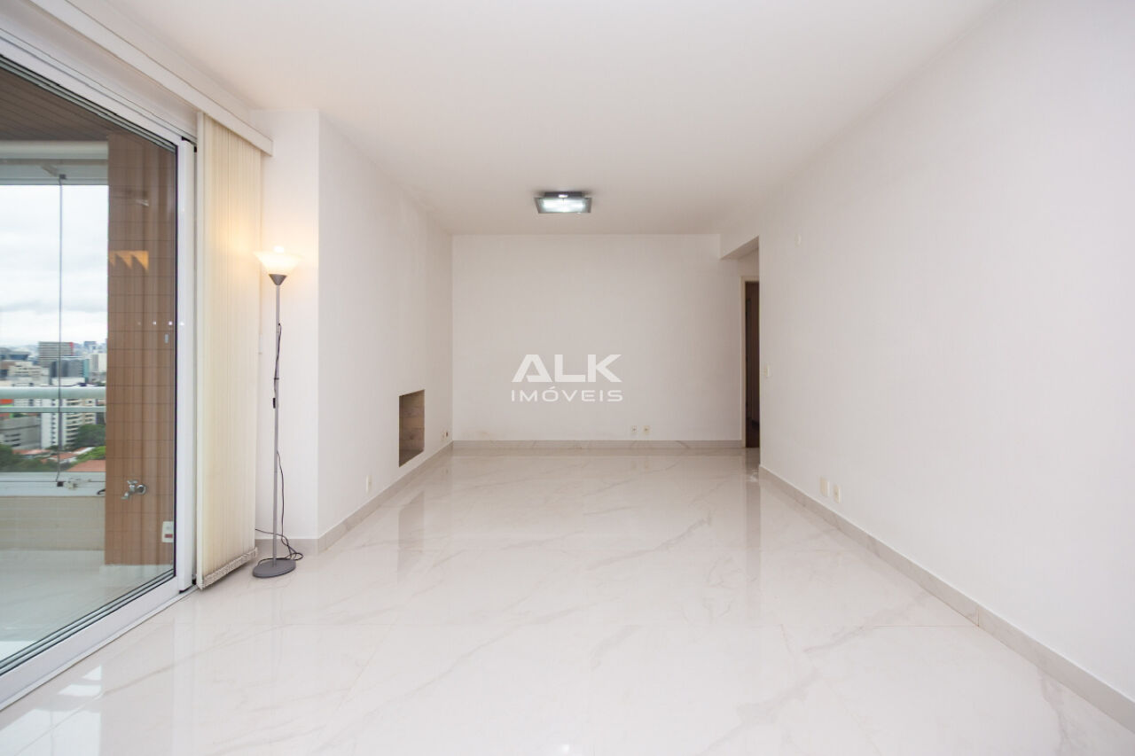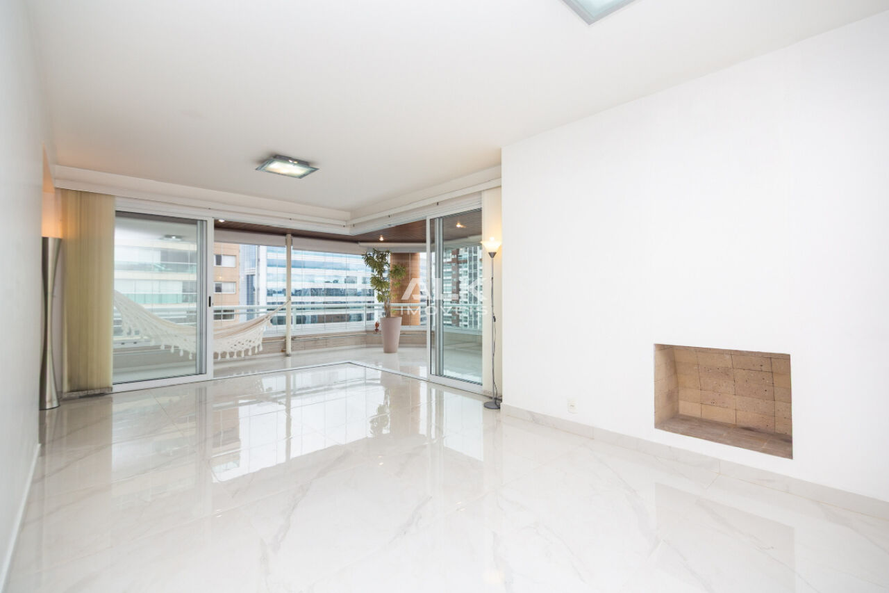A sala é ampla e iluminada, possui lareira e uma deliciosa varanda envidraçada em L com vista gostosa do alto do bairro.