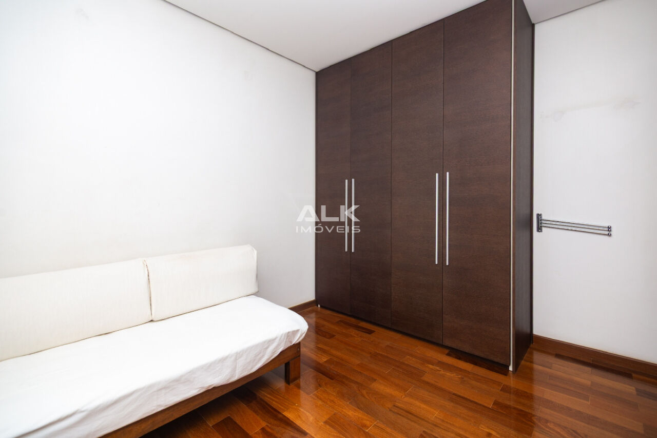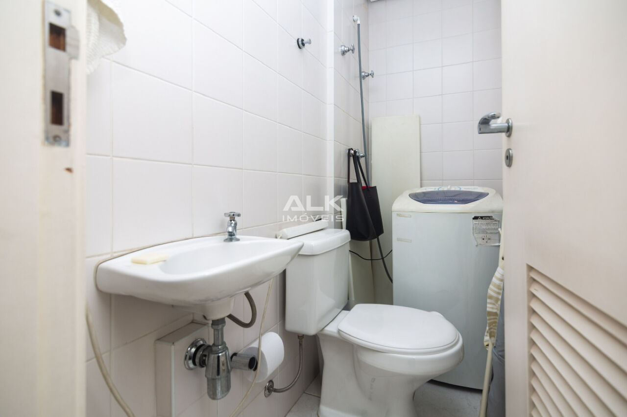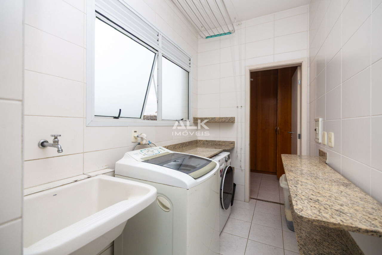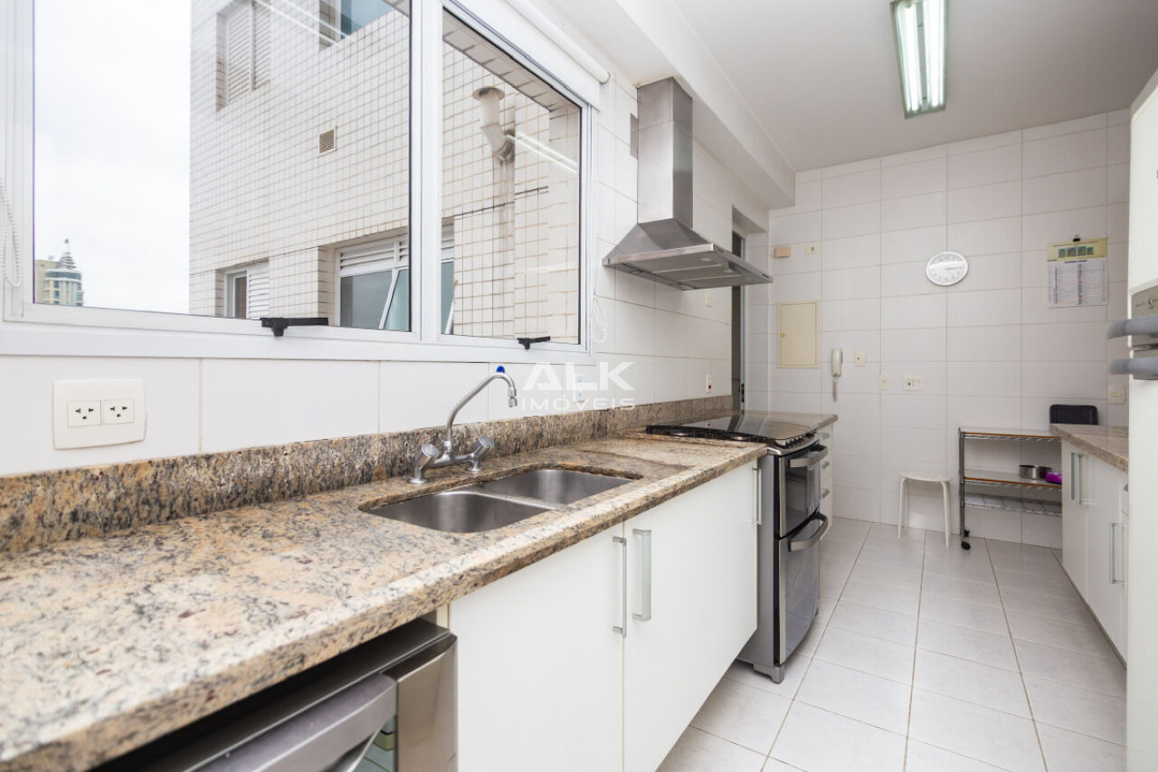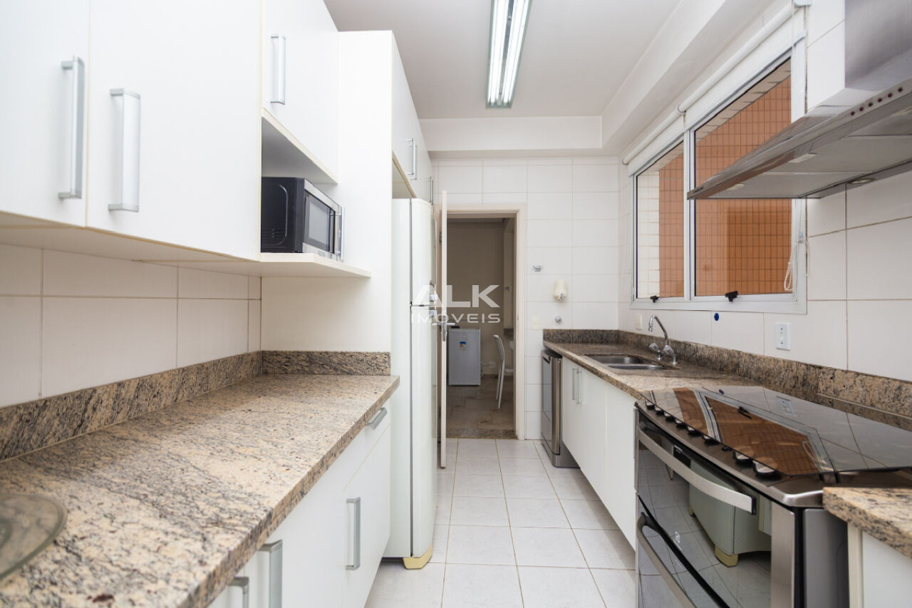 Cozinha repleta de armários, assim como a área de serviço que possui quarto e banheiro.
