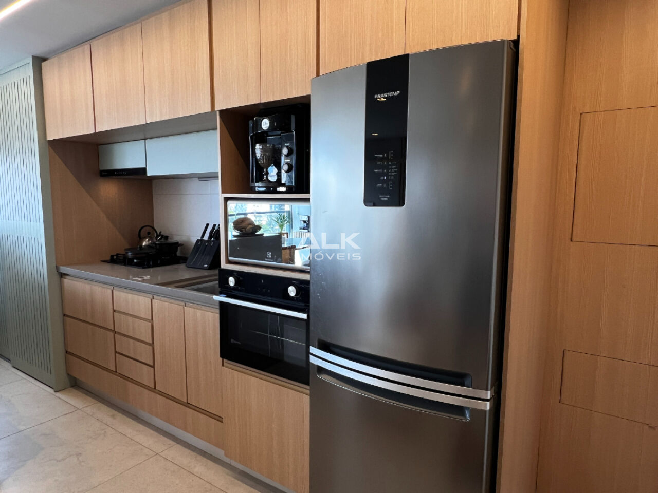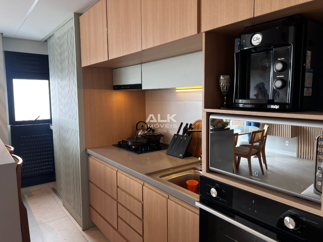 Área de serviço oculta na cozinha com ármarios planejados e aquecedor