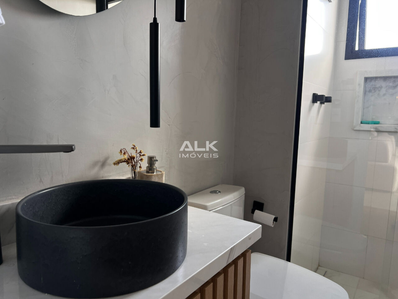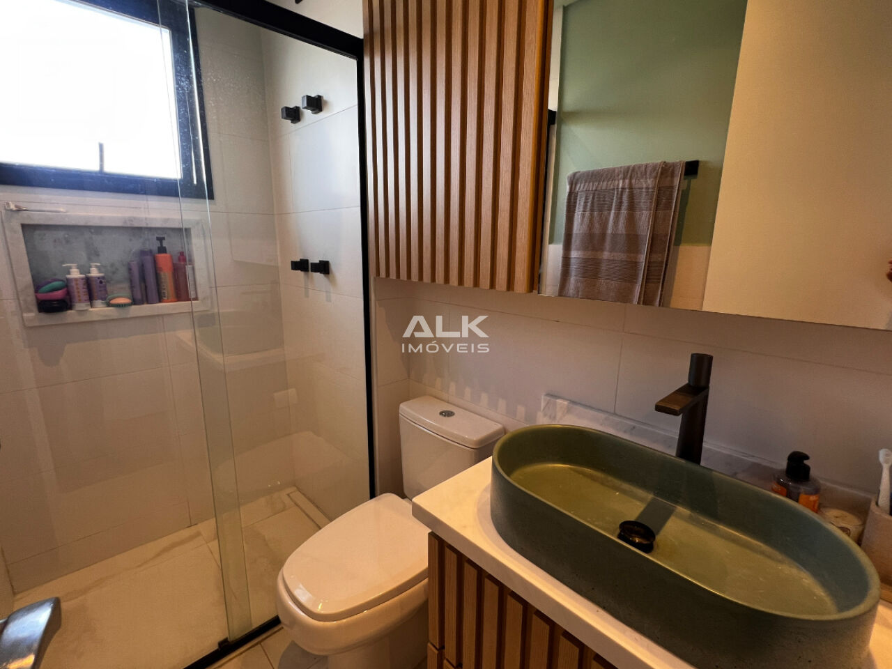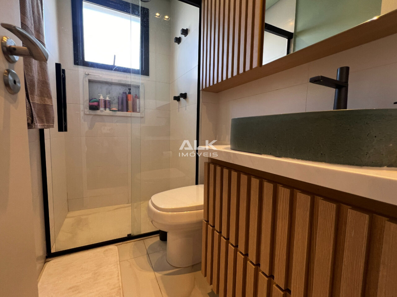 Suíte com armários planejados, banheiro suíte com gabinete e armário superior;