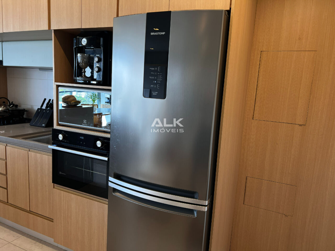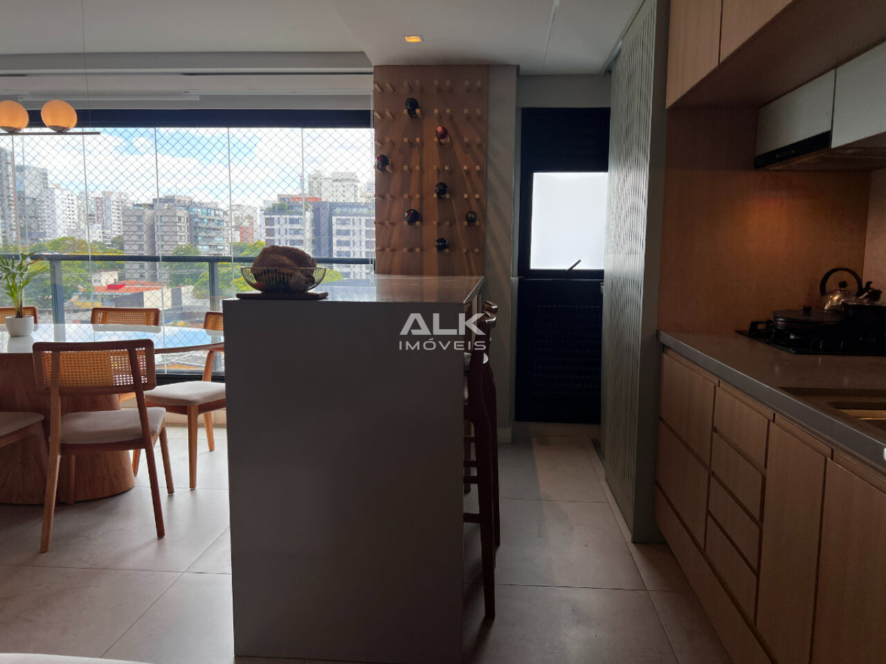 Cozinha com armários planejados, bancada alta com 2 lugares.