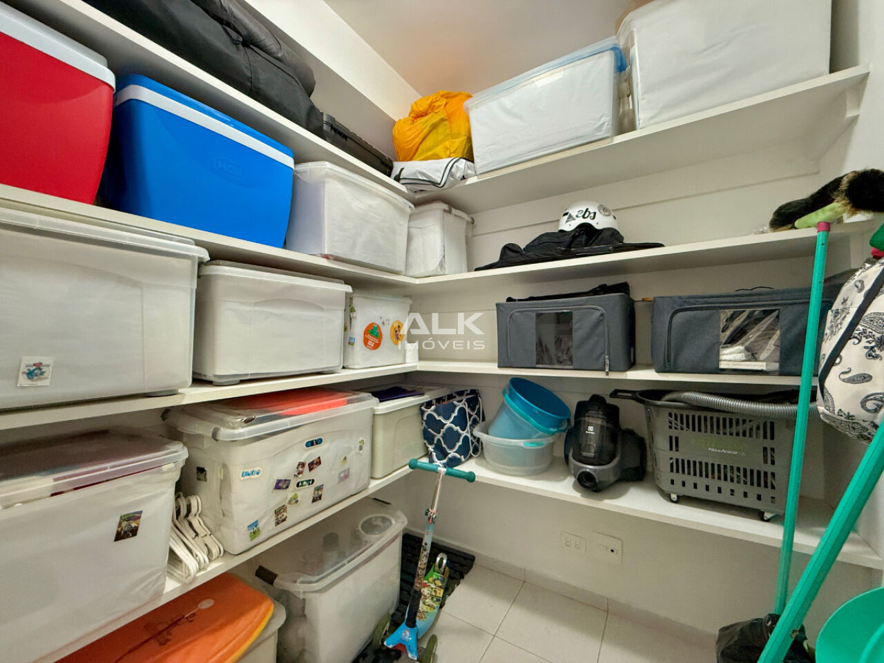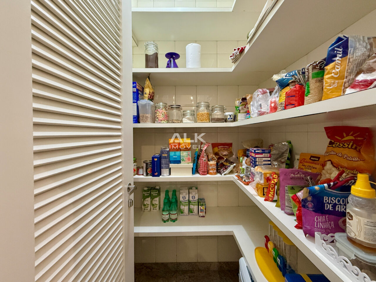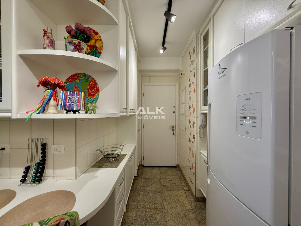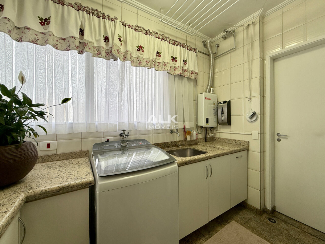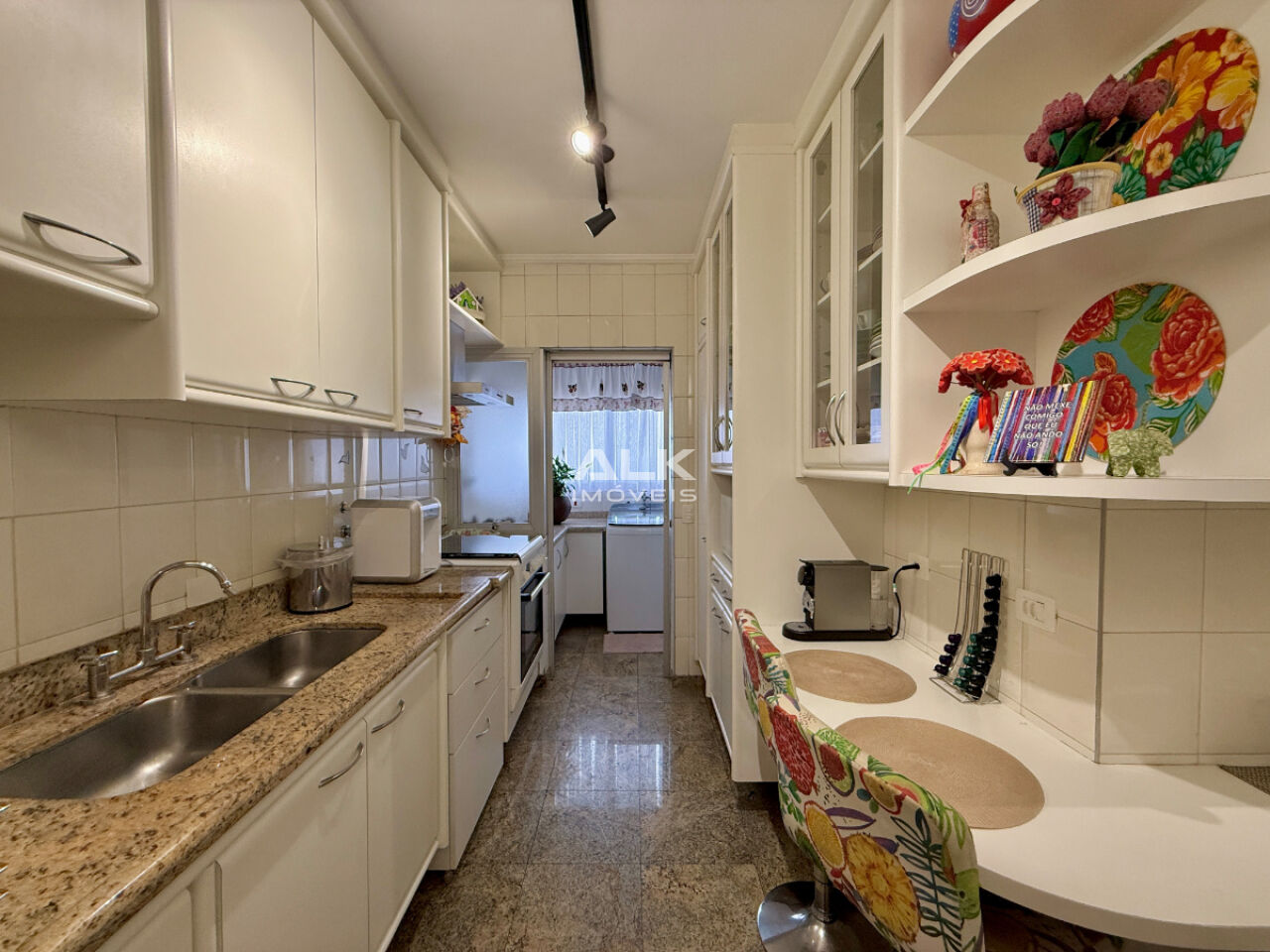 A cozinha é moderna, funcional e repleta de armários planejados, integrada a uma área de serviço completa, com lavanderia e dependência de serviço.