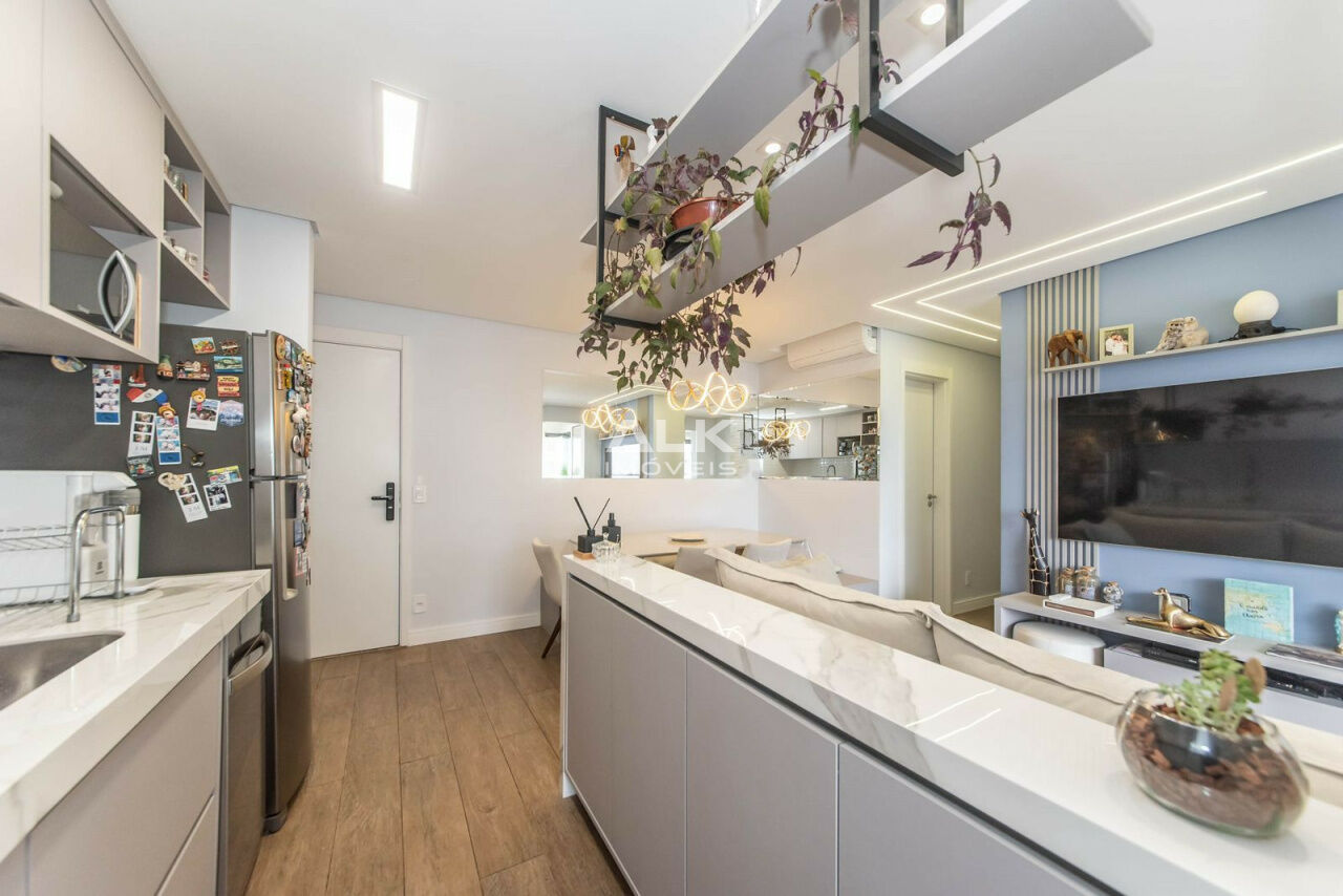 São 2 dormitórios, sendo 1 suíte, living para 2 ambientes, área de serviço e uma vaga.