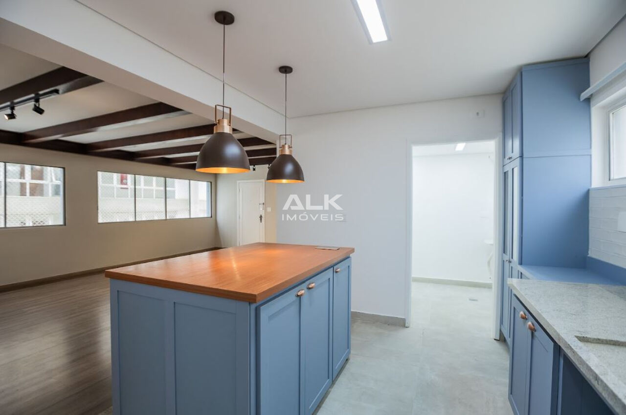 Os espaços são amplos e banhados de luz natural pelos grandes janelões. A cozinha, com ilha central e acabamentos de alto padrão, é um convite para receber amigos e família.