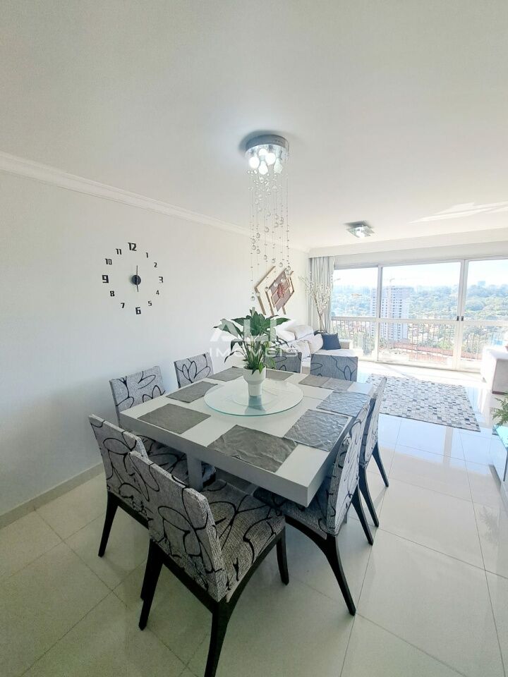 A área social é esplêndida, com uma ampla sala de estar que se destaca pela vista panorâmica, inundando o ambiente de luz natural e oferecendo um cenário espetacular para receber visitas ou relaxar em momentos tranquilos. Adjacente à sala de estar, encontra-se uma sala de jantar perfeita para desfrutar de refeições em família ou entre amigos.