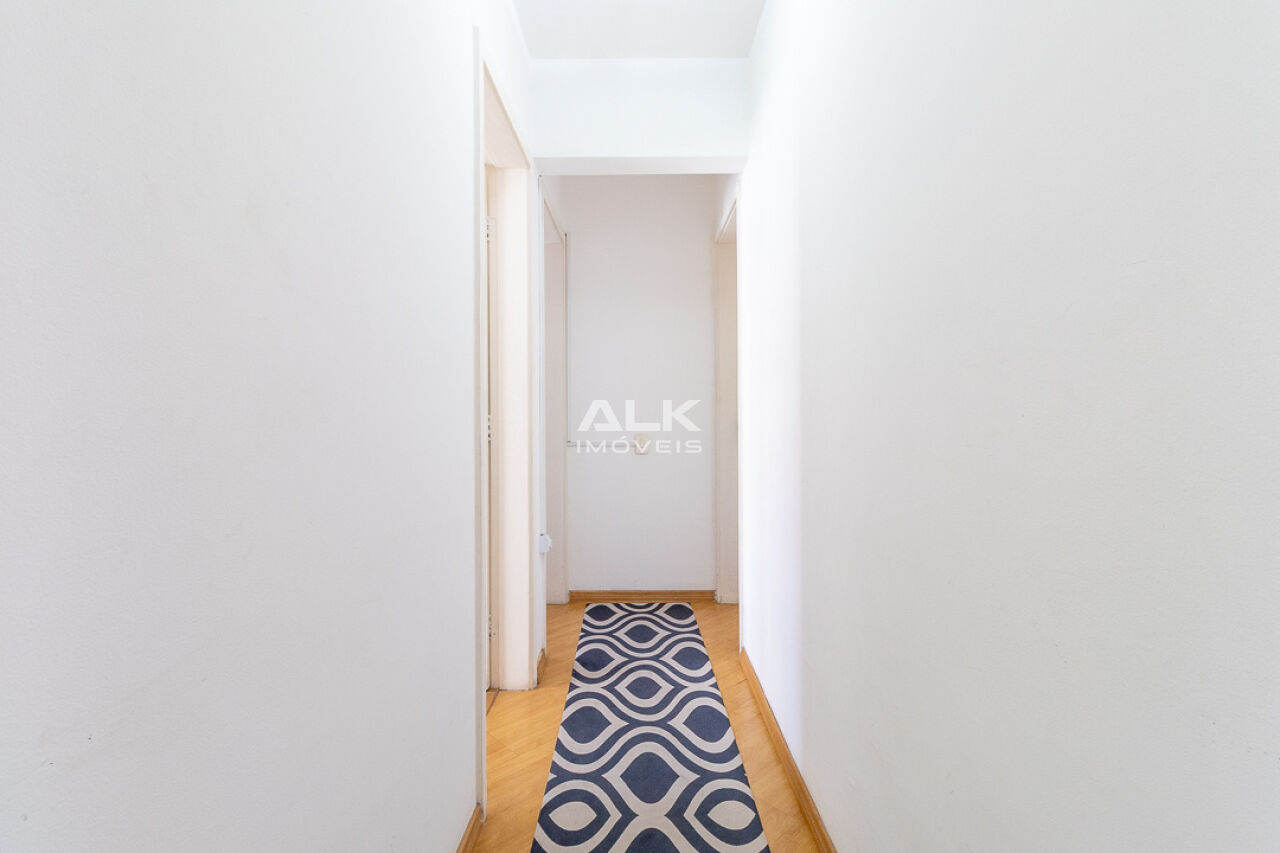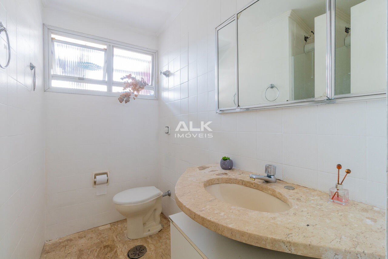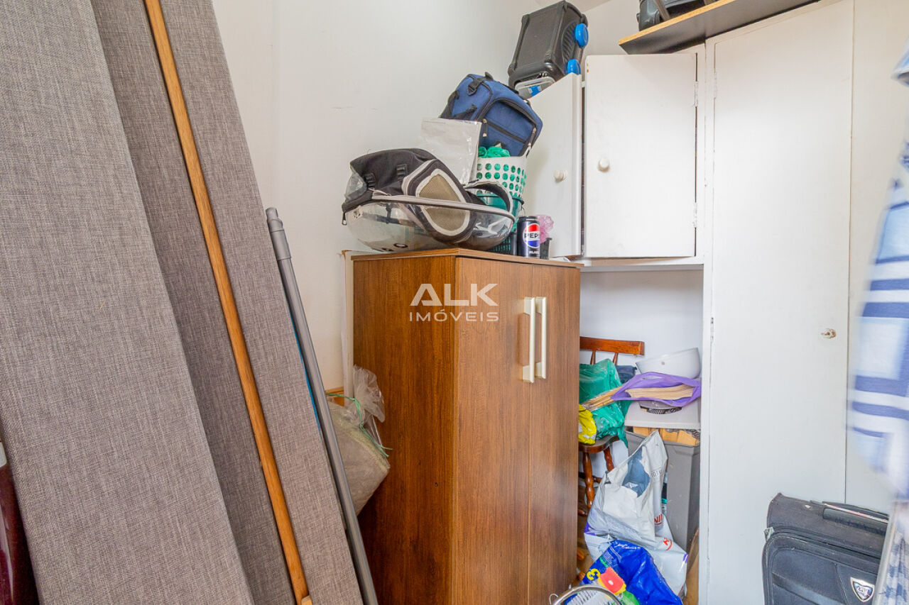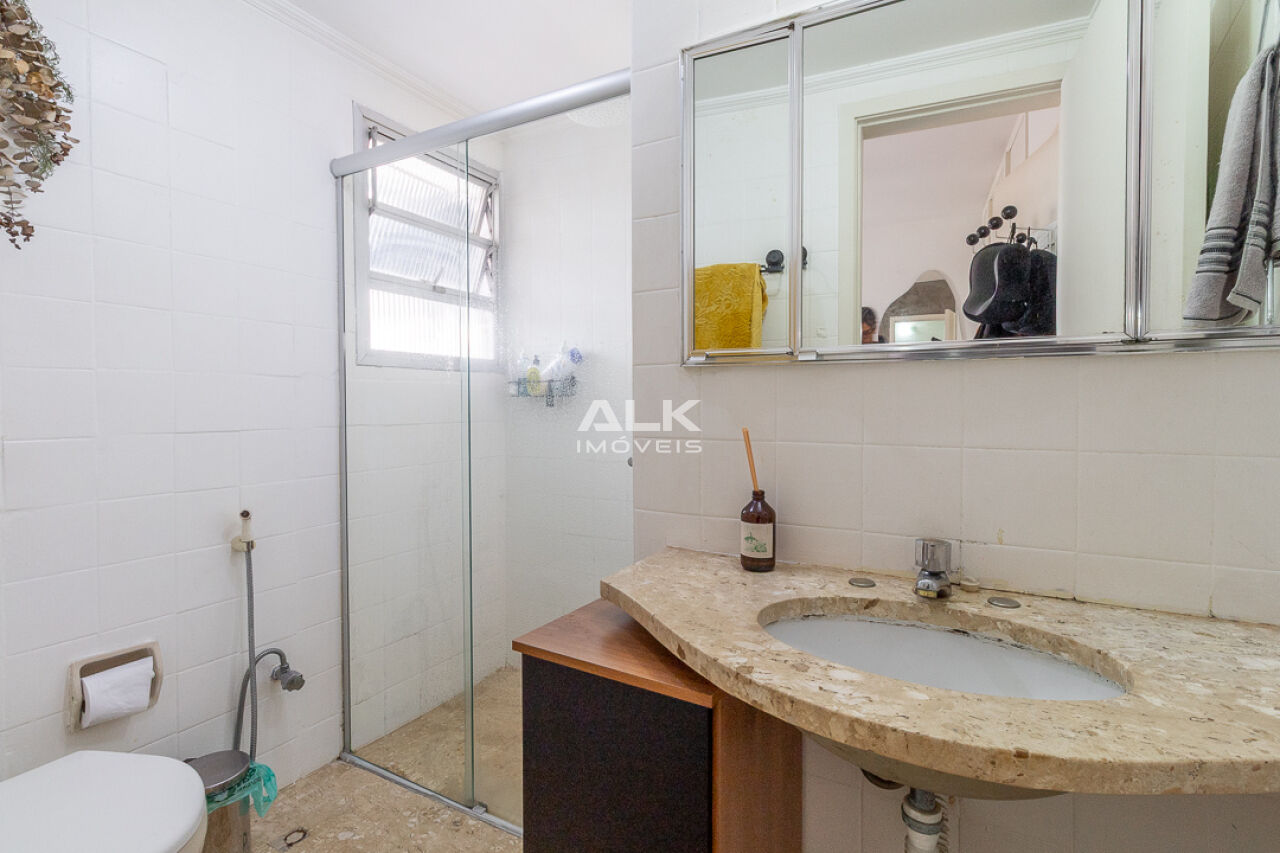 A área íntima, isolada por um corredor, traz um layout bem distribuído. À direita, o banheiro social atende aos dois dormitórios, com ventilação natural, armário sob a pia e chuveiro elétrico. O primeiro quarto, à esquerda, possui grande janela, armário embutido de quatro portas em madeira de qualidade, podendo ser revitalizado do seu jeito. O segundo dormitório também conta com armário e janela ampla com vista lateral. A suíte é bem ventilada e espaçosa, comportando facilmente uma cama king size, possui armário embutido.