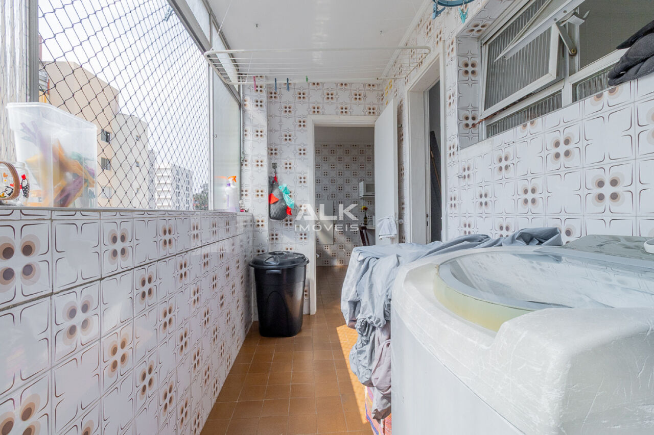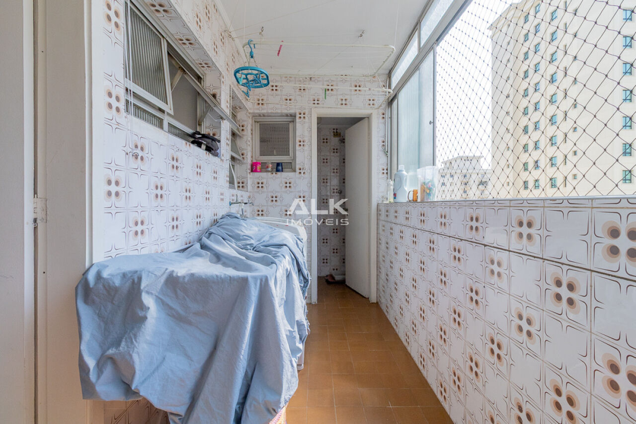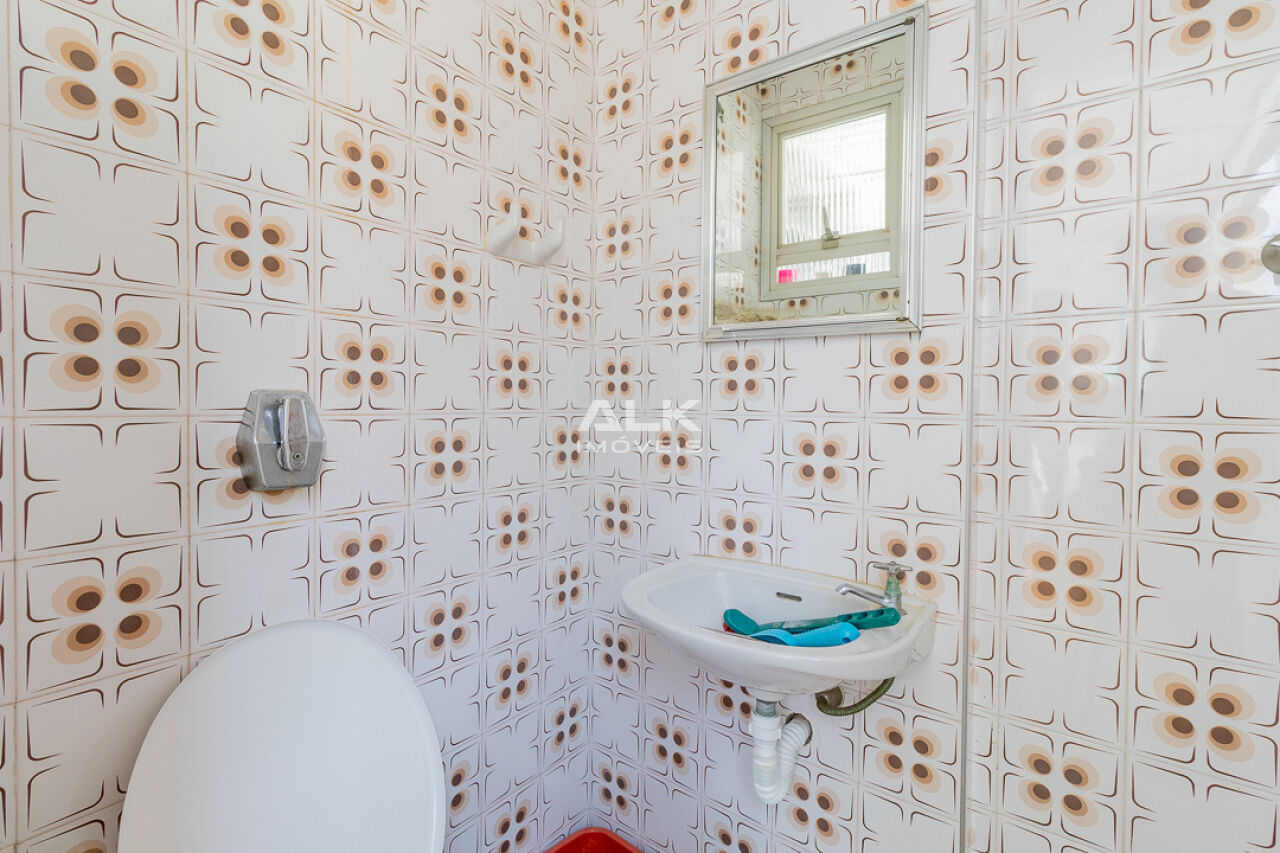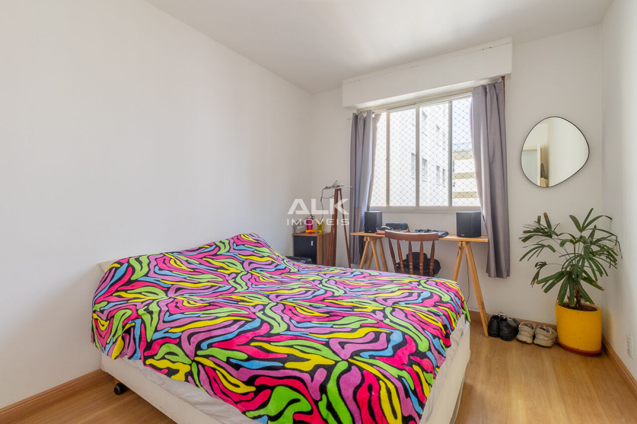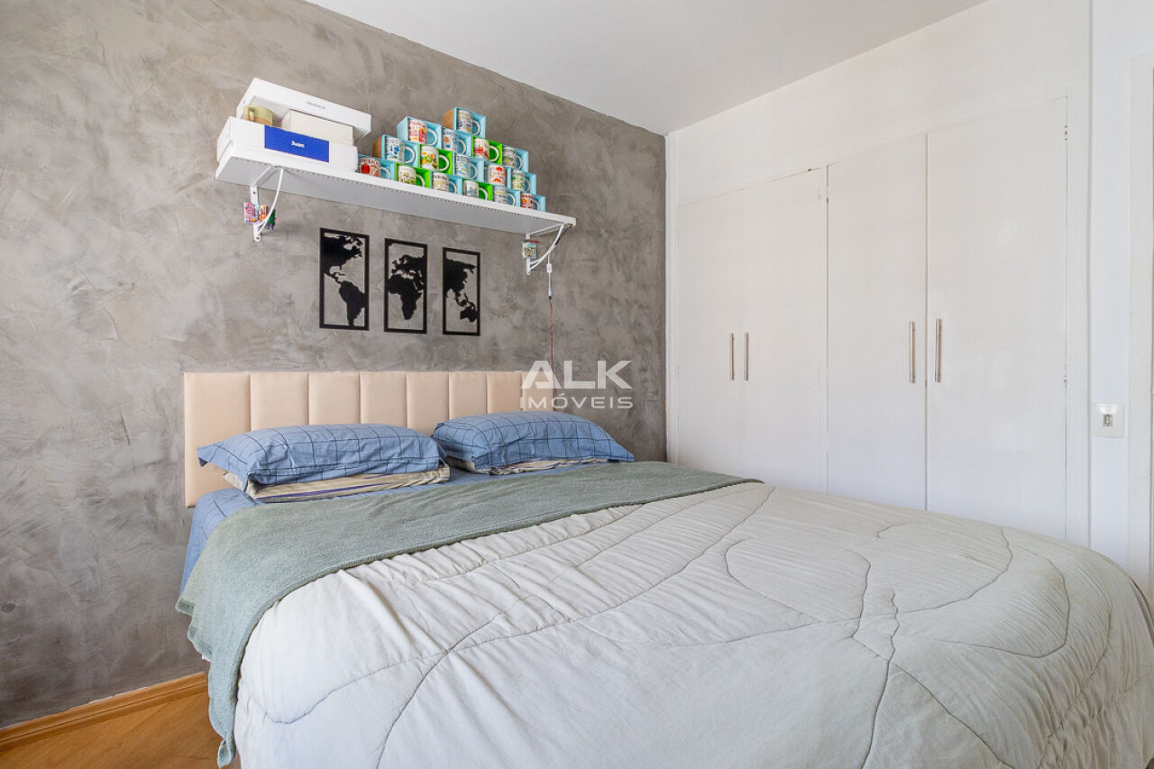 A área íntima, isolada por um corredor, traz um layout bem distribuído. À direita, o banheiro social atende aos dois dormitórios, com ventilação natural, armário sob a pia e chuveiro elétrico. O primeiro quarto, à esquerda, possui grande janela, armário embutido de quatro portas em madeira de qualidade, podendo ser revitalizado do seu jeito. O segundo dormitório também conta com armário e janela ampla com vista lateral. A suíte é bem ventilada e espaçosa, comportando facilmente uma cama king size, possui armário embutido.