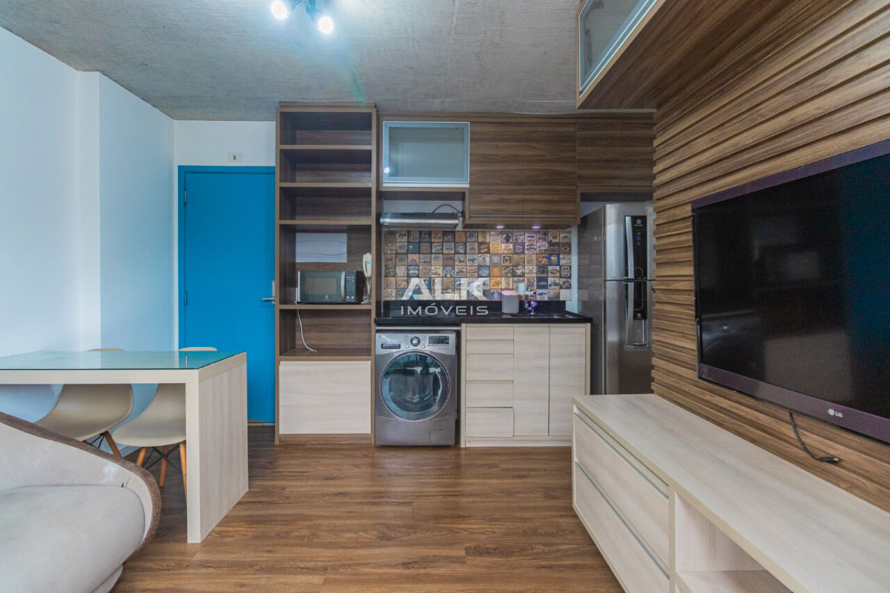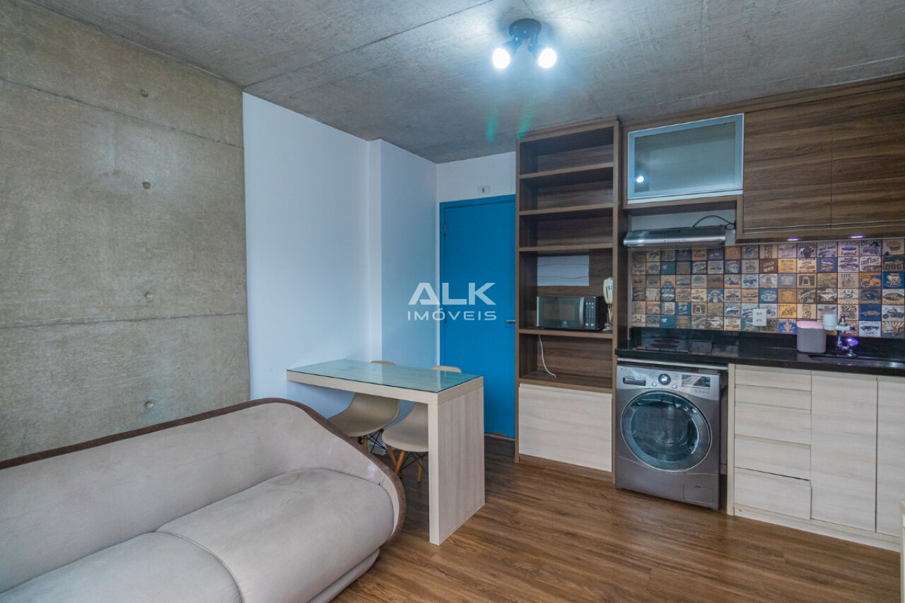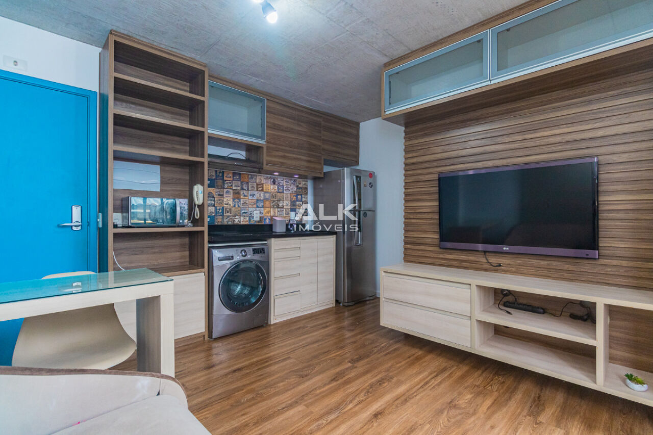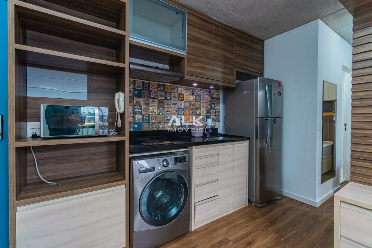 Studio de 32 metros quadrados com 1 quarto com ar-condicionado, 1 banheiro, varanda, sala integrada a cozinha, 1 vaga de garagem com serviço de manobrista. É ideal para quem procura conforto e comodidade. O condomínio tem academia e espaço gourmet.