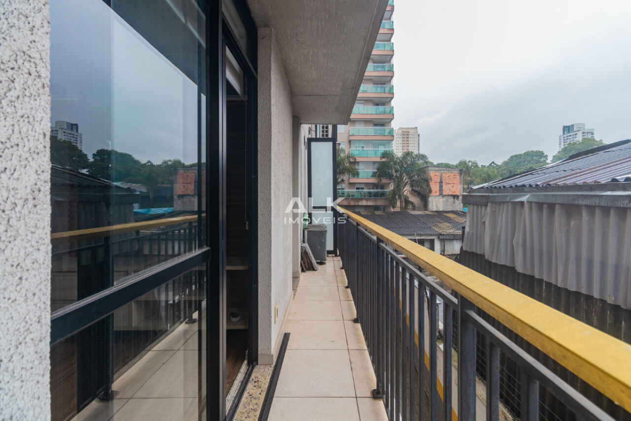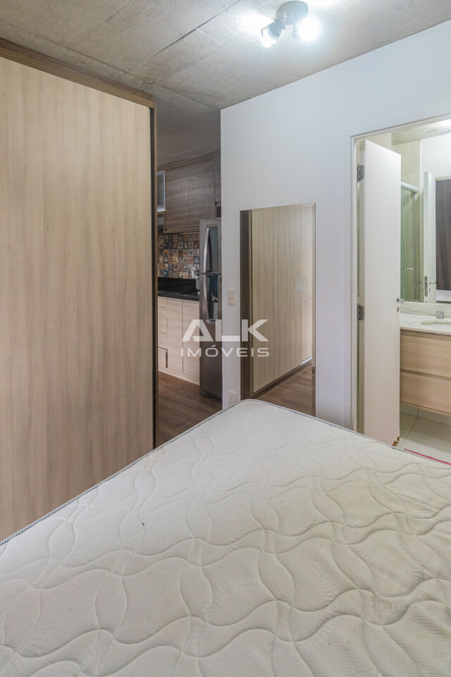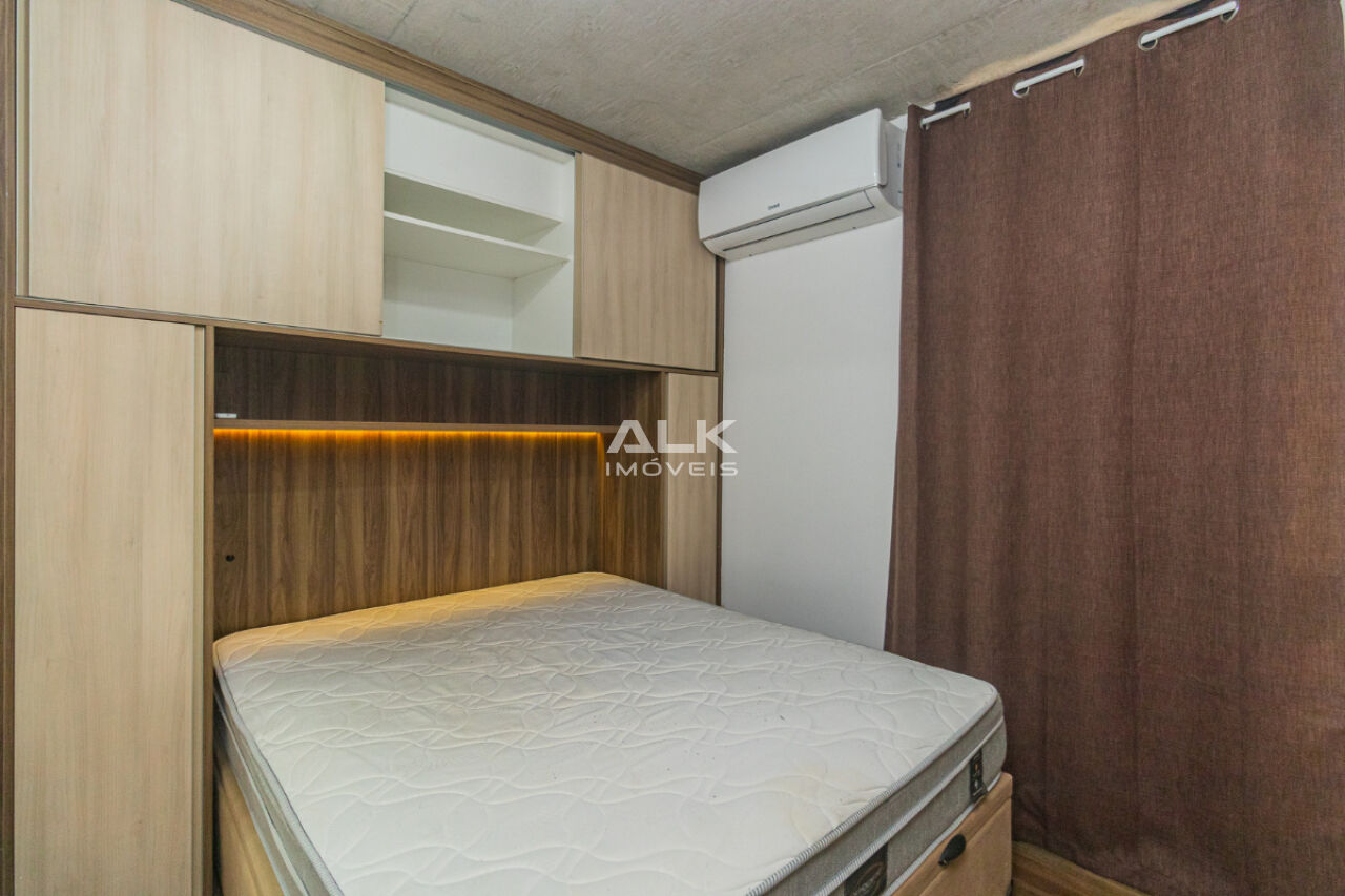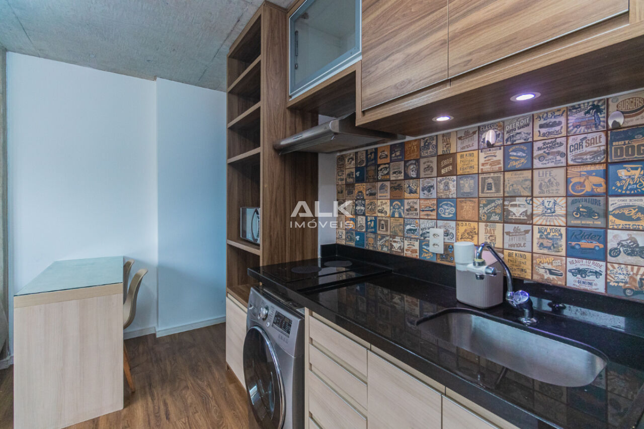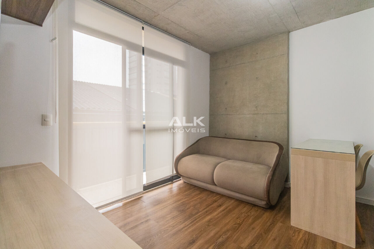 Studio de 32 metros quadrados com 1 quarto com ar-condicionado, 1 banheiro, varanda, sala integrada a cozinha, 1 vaga de garagem com serviço de manobrista. É ideal para quem procura conforto e comodidade. O condomínio tem academia e espaço gourmet.