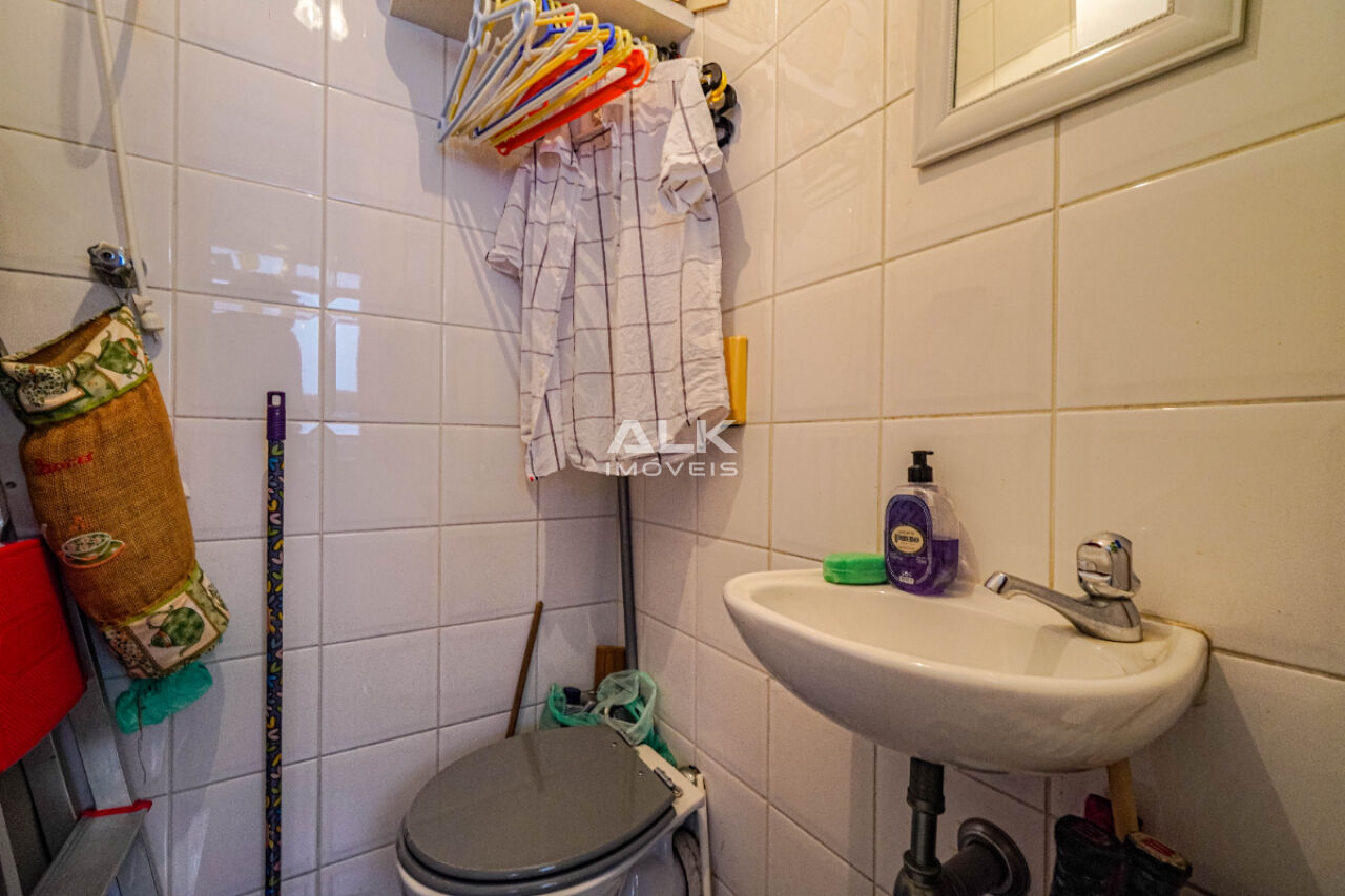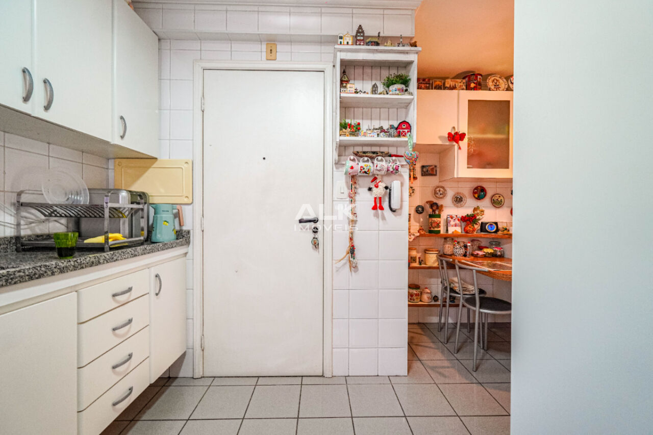 A copa e cozinha planejadas são integradas de forma prática, equipadas com armários sob medida e ar-condicionado quente e frio em pontos estratégicos.