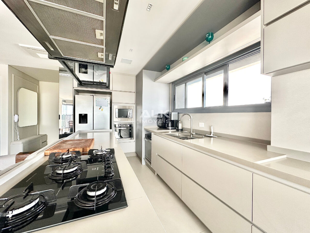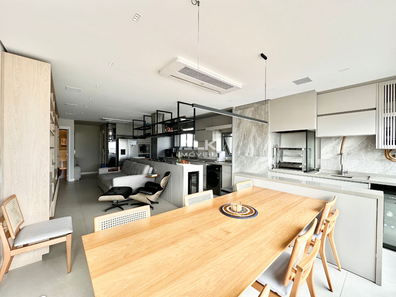 A área social é um verdadeiro convite ao convívio: cozinha integrada à sala e à varanda gourmet, criando um ambiente moderno, fluido e extremamente acolhedor. A varanda gourmet possui churrasqueira a carvão e se conecta perfeitamente ao living, ideal para receber amigos e familiares. Os móveis planejados são de primeira linha, a decoração é fina e de extremo bom gosto, e o conforto é elevado com ar-condicionado em todos os ambientes. O apartamento é totalmente automatizado, com assistente virtual Alexa, trazendo tecnologia, praticidade e sofisticação ao dia a dia.