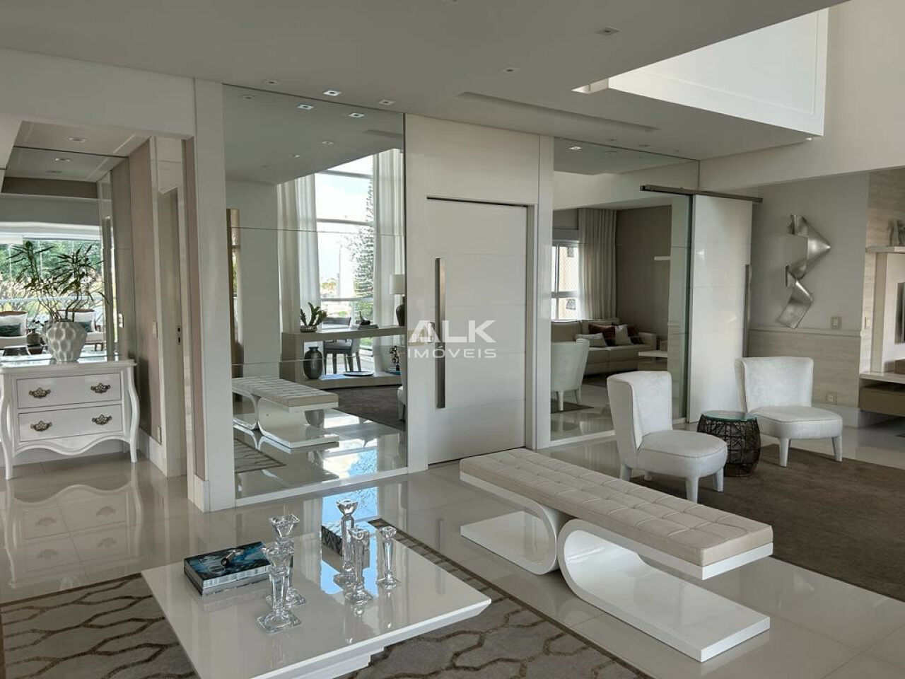 Living com pé direito duplo envidraçado trazendo uma luminosidade ímpar ao imóvel, proporcionando uma sensação de amplitude e elegância incomparáveis.