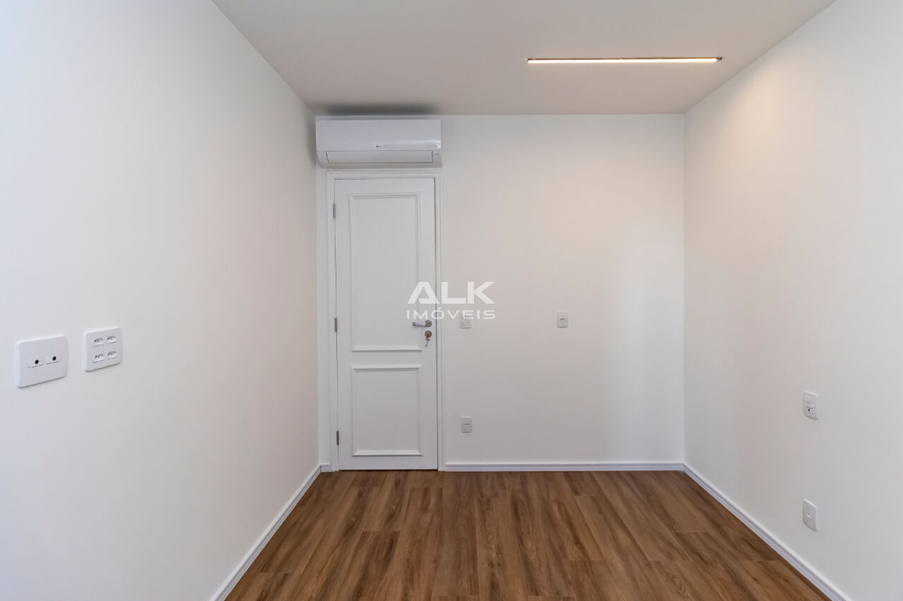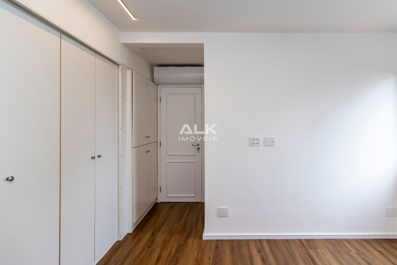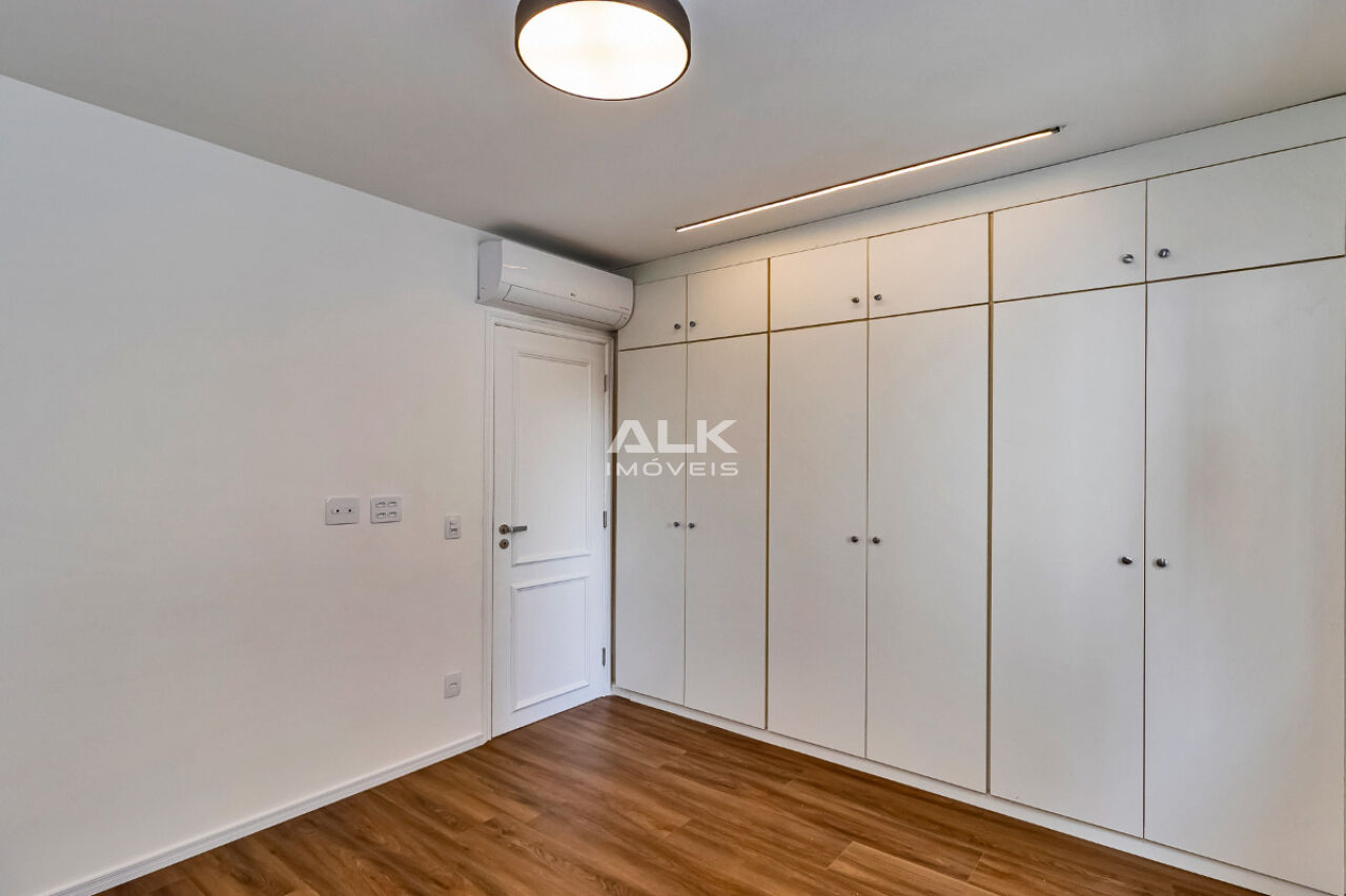 Aproveitamos para criar armários sob medida na cozinha, área de serviço e banheiros, reformar os armários dos quartos e instalar máquinas de ar-condicionado novas em todos os ambientes.