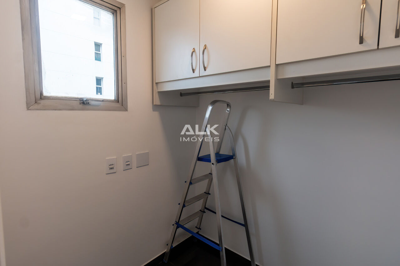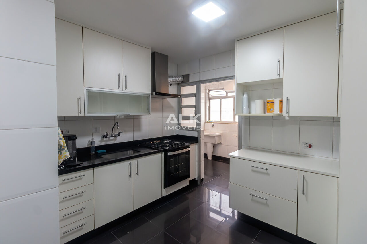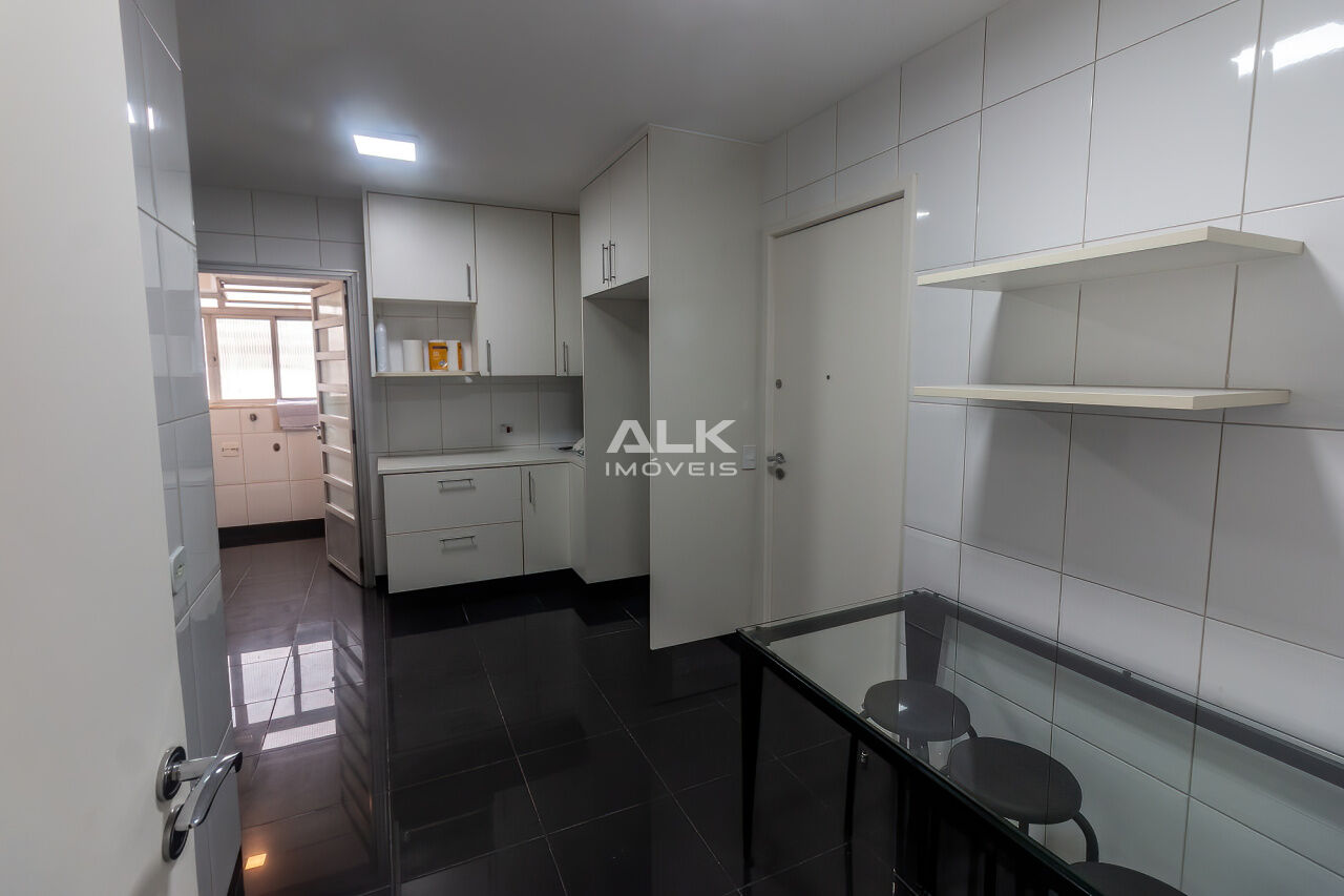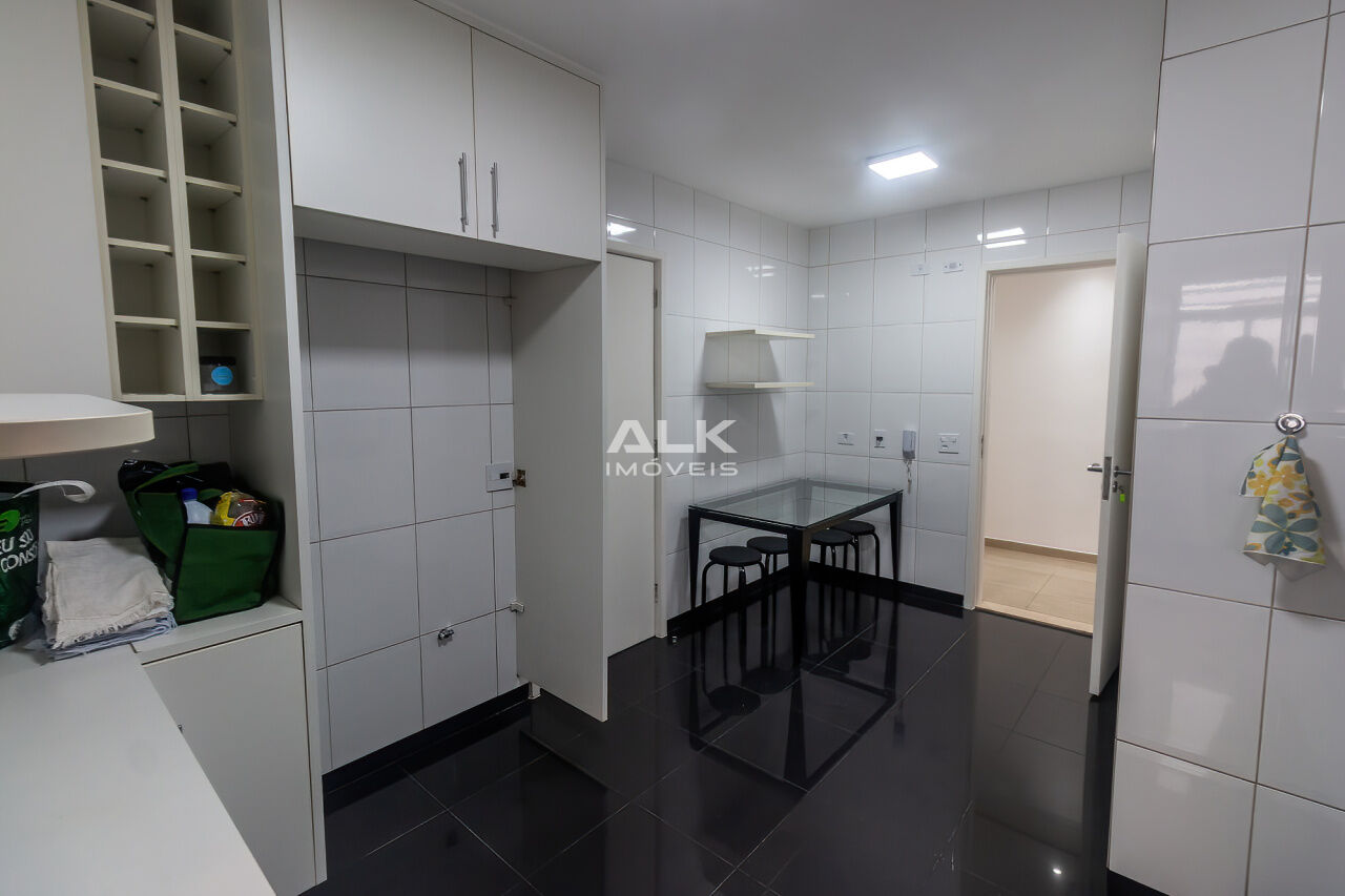 A cozinha e a copa integradas oferecem ótimo aproveitamento de espaço e funcionalidade, com muitos armários e boa ventilação. O imóvel conta ainda com banheiro social, área de serviço completa, banheiro e quarto de serviço, além de uma vaga de garagem.