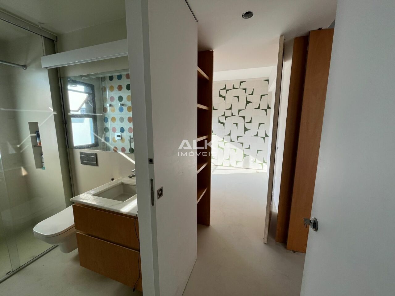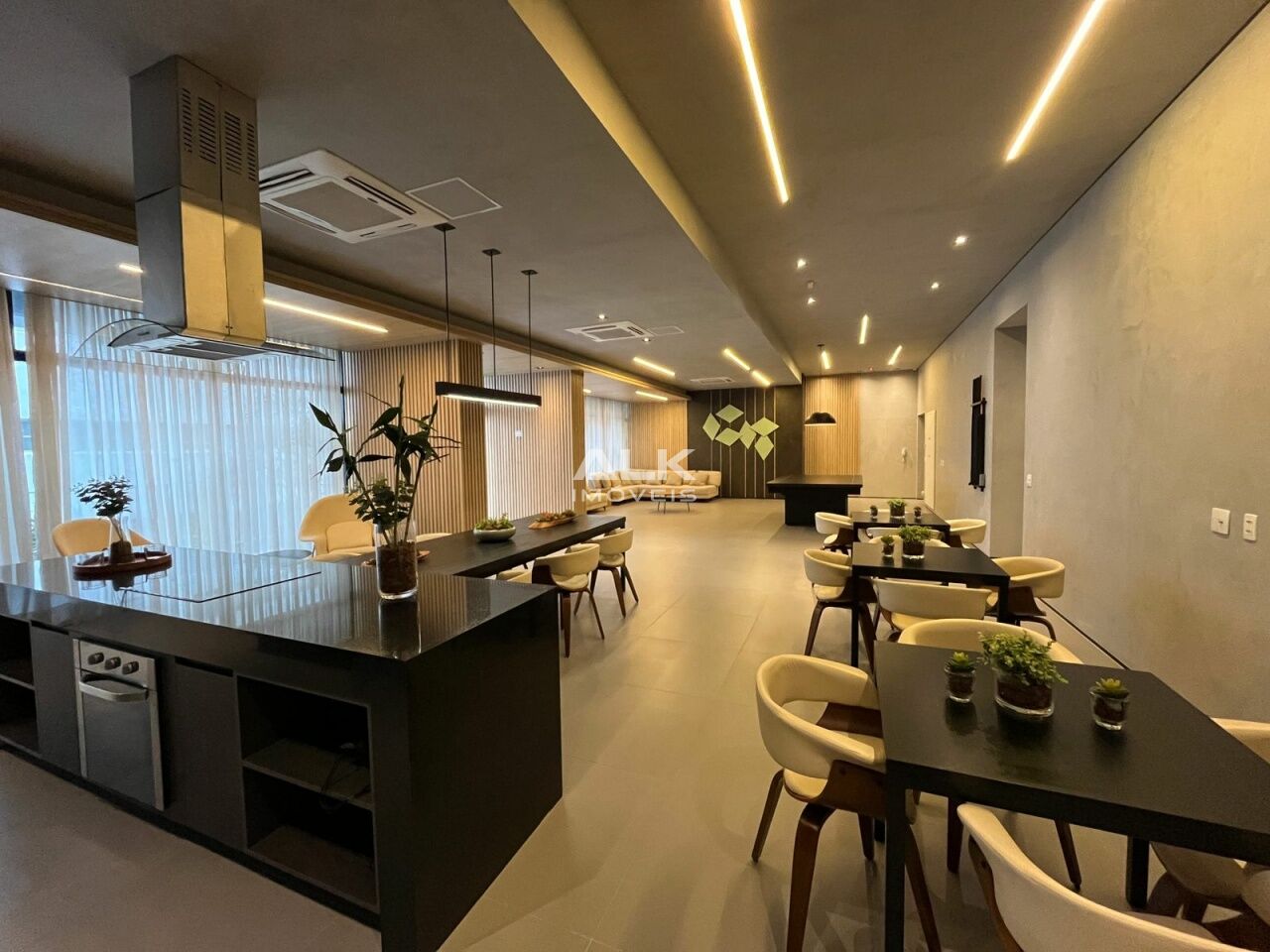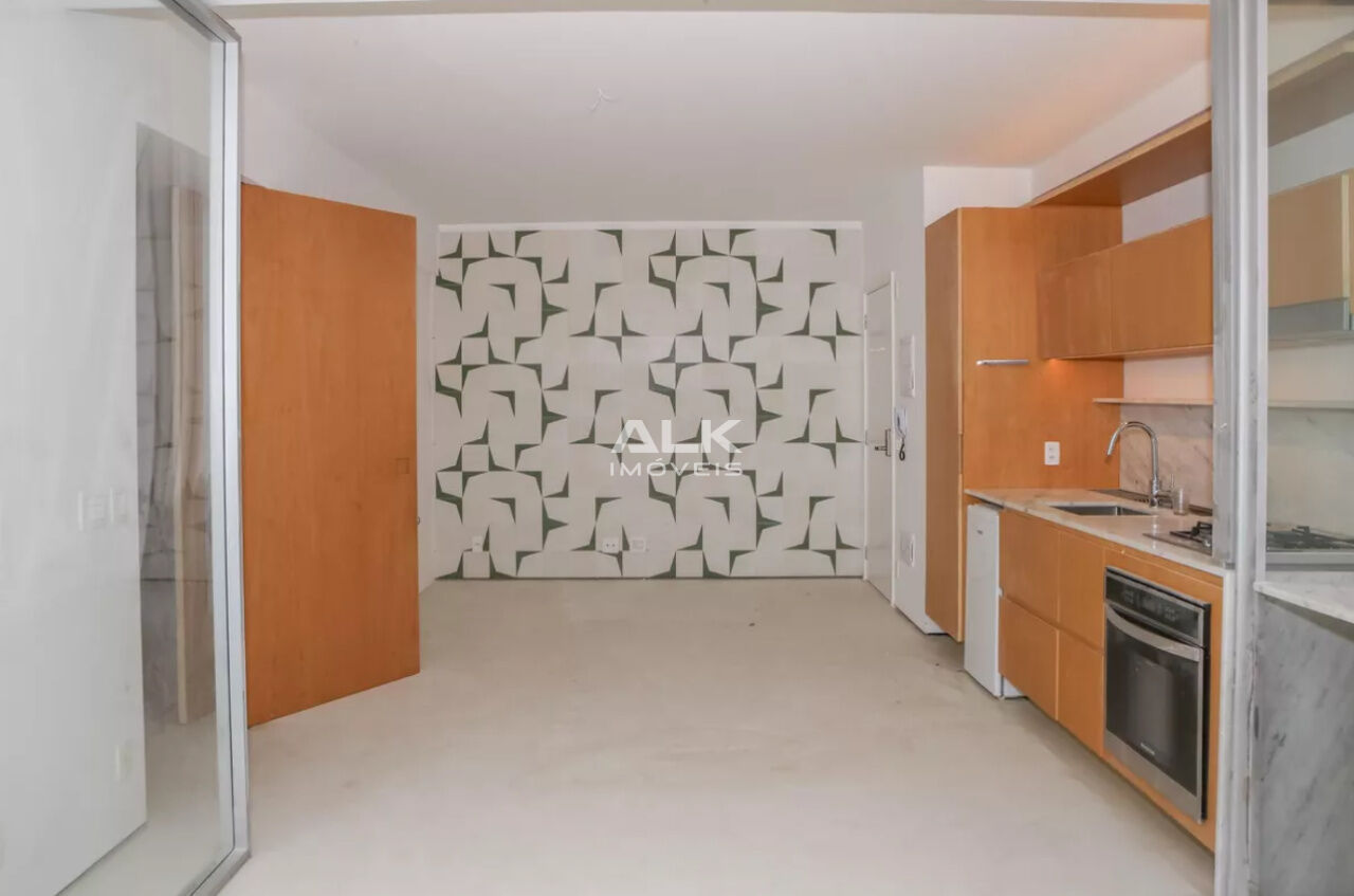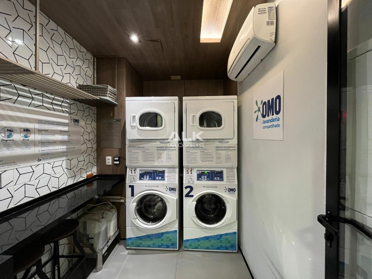Cozinha equipada com armários, frigobar, forno elétrico, cooktop, micro-ondas e lava louças;
