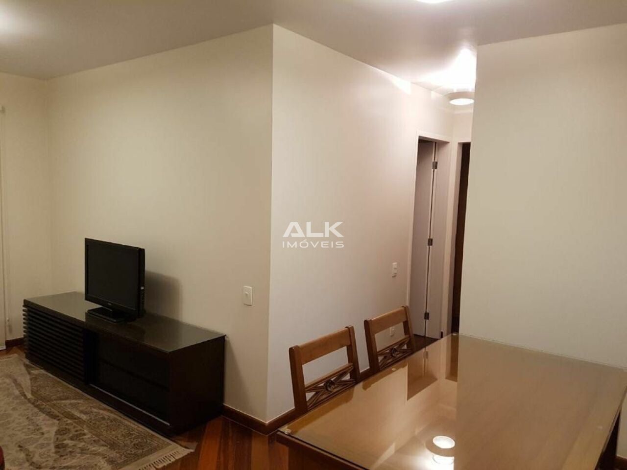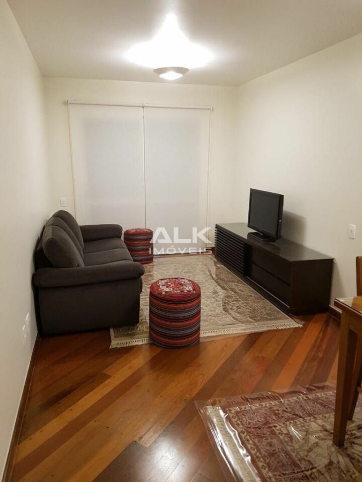 Totalmente mobiliado com cama, armários, geladeira, cocktop, micro-ondas, forno, televisão, máquina de lavar, cortina, mesa de jantar, mesa de escritório, sofá.