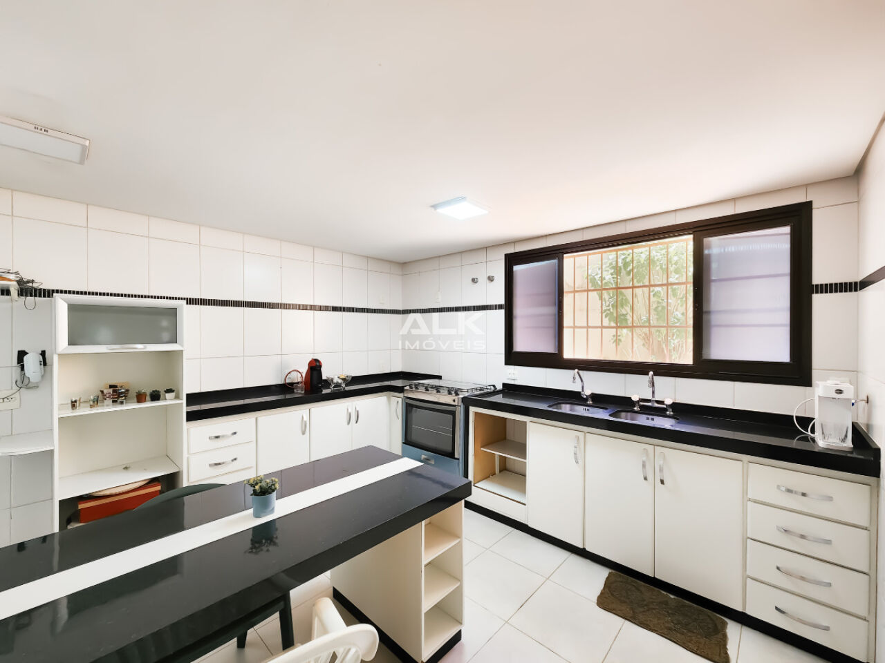 A cozinha é espaçosa com armários já instalados e tem uma despensa para armazenamento.