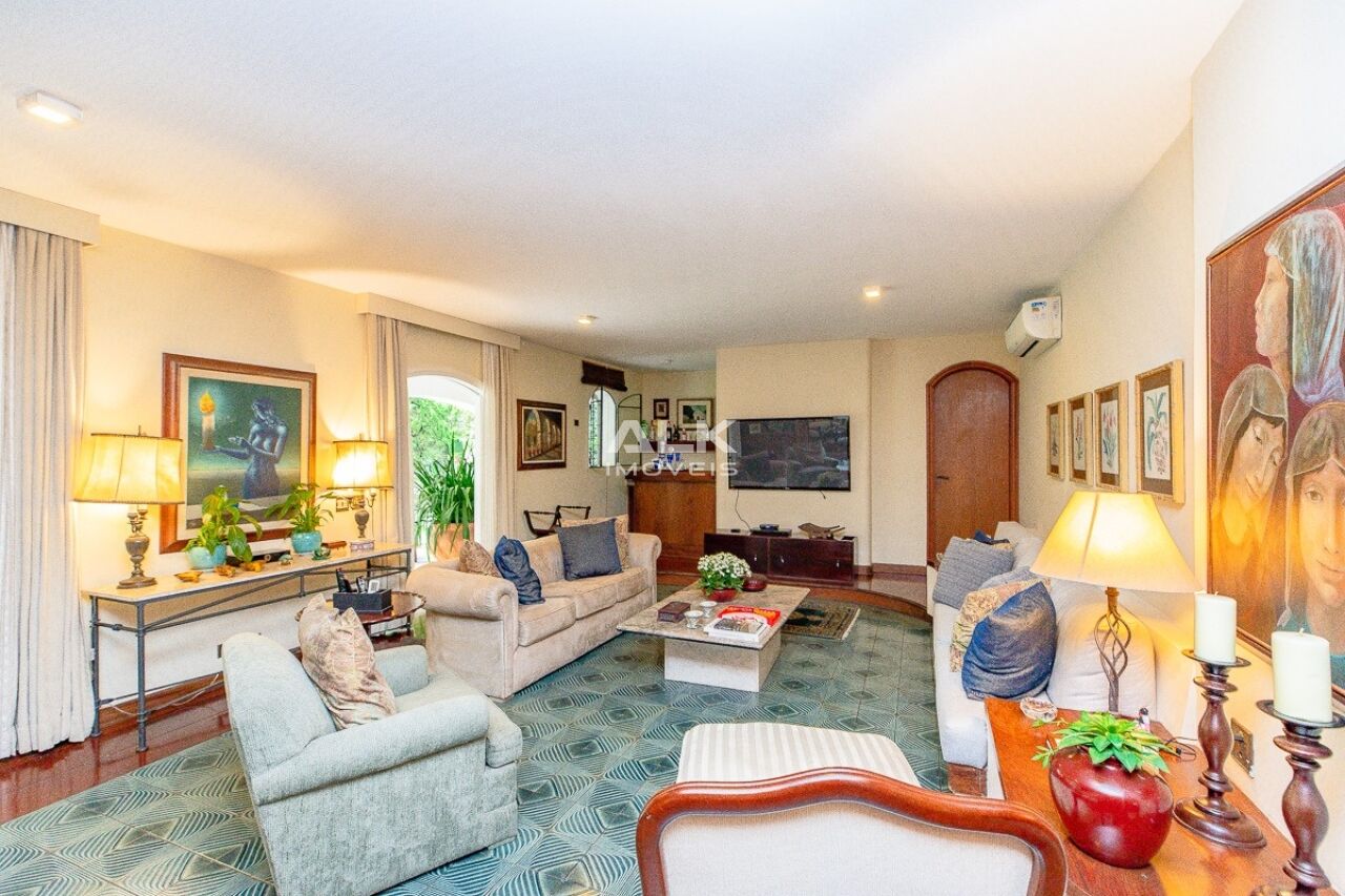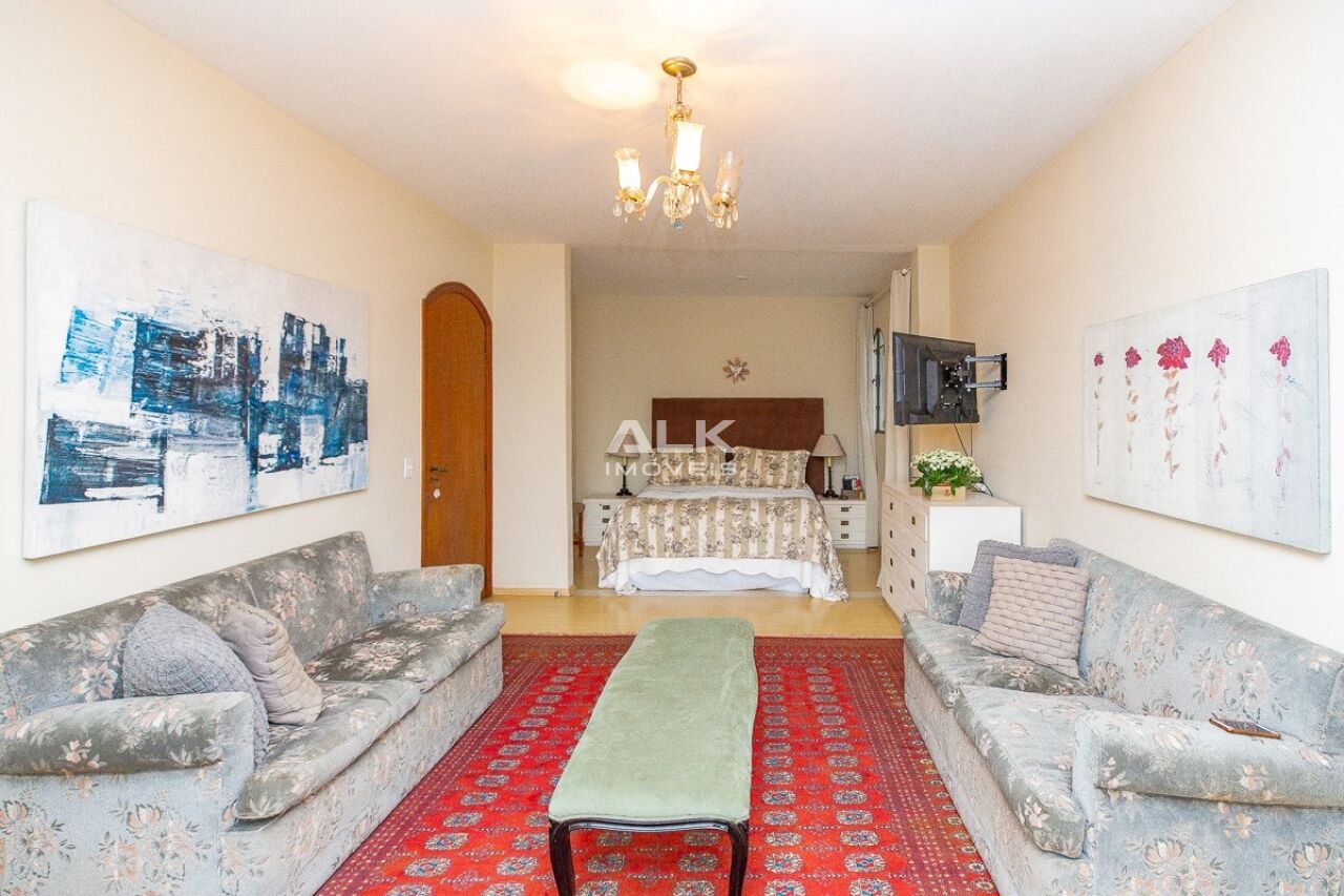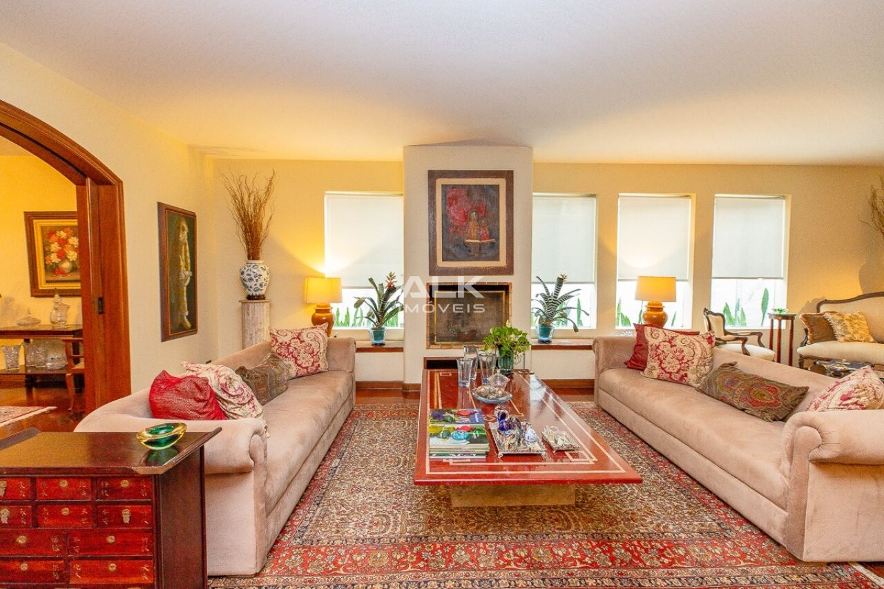 O living principal possui sala para 3 ambientes, bar e um escritório. A sala ainda conta com lareira e janelas largas que iluminam todo espaço.