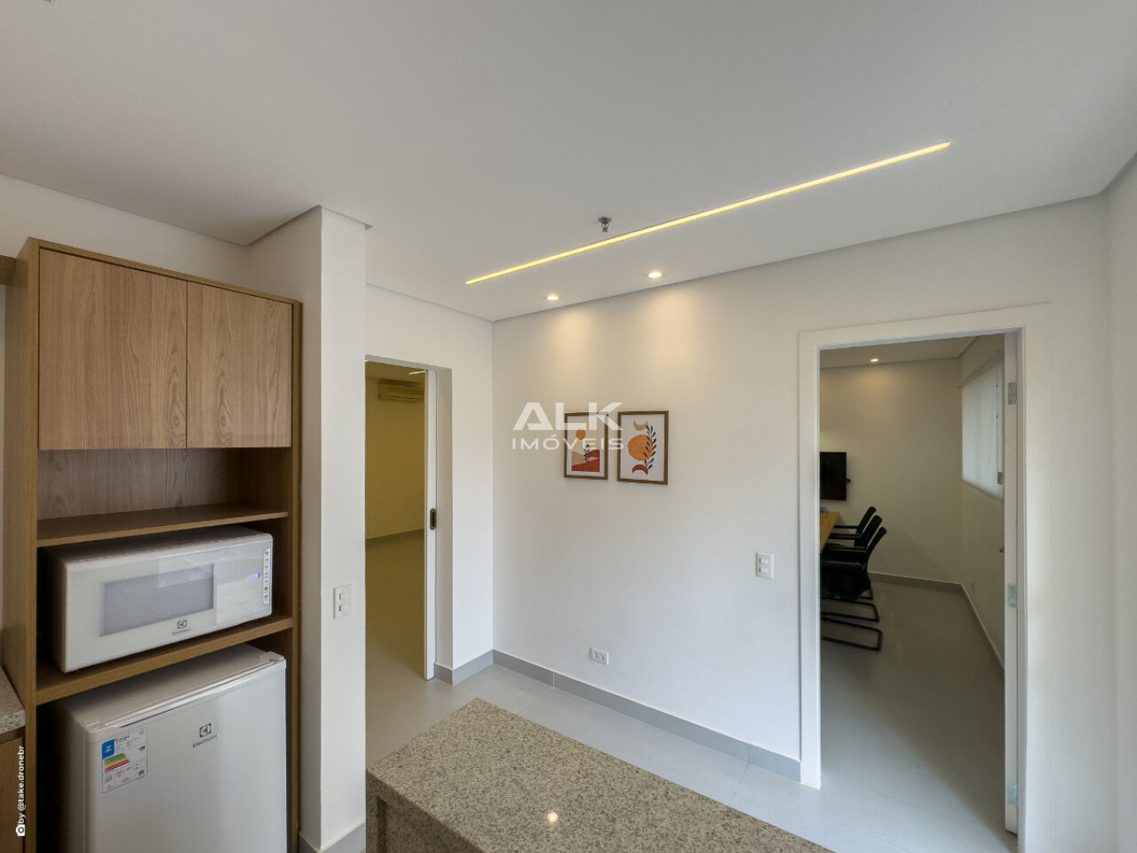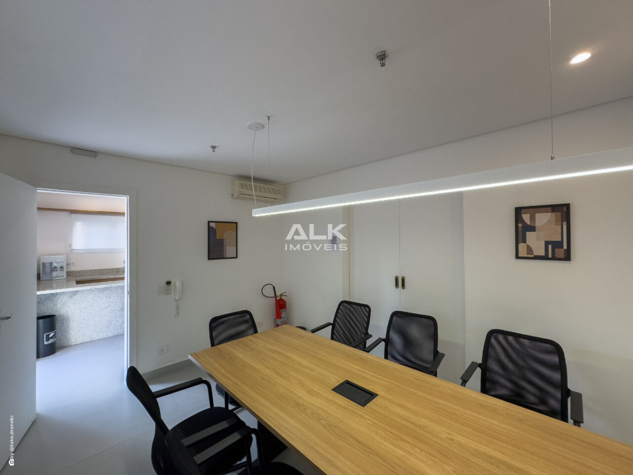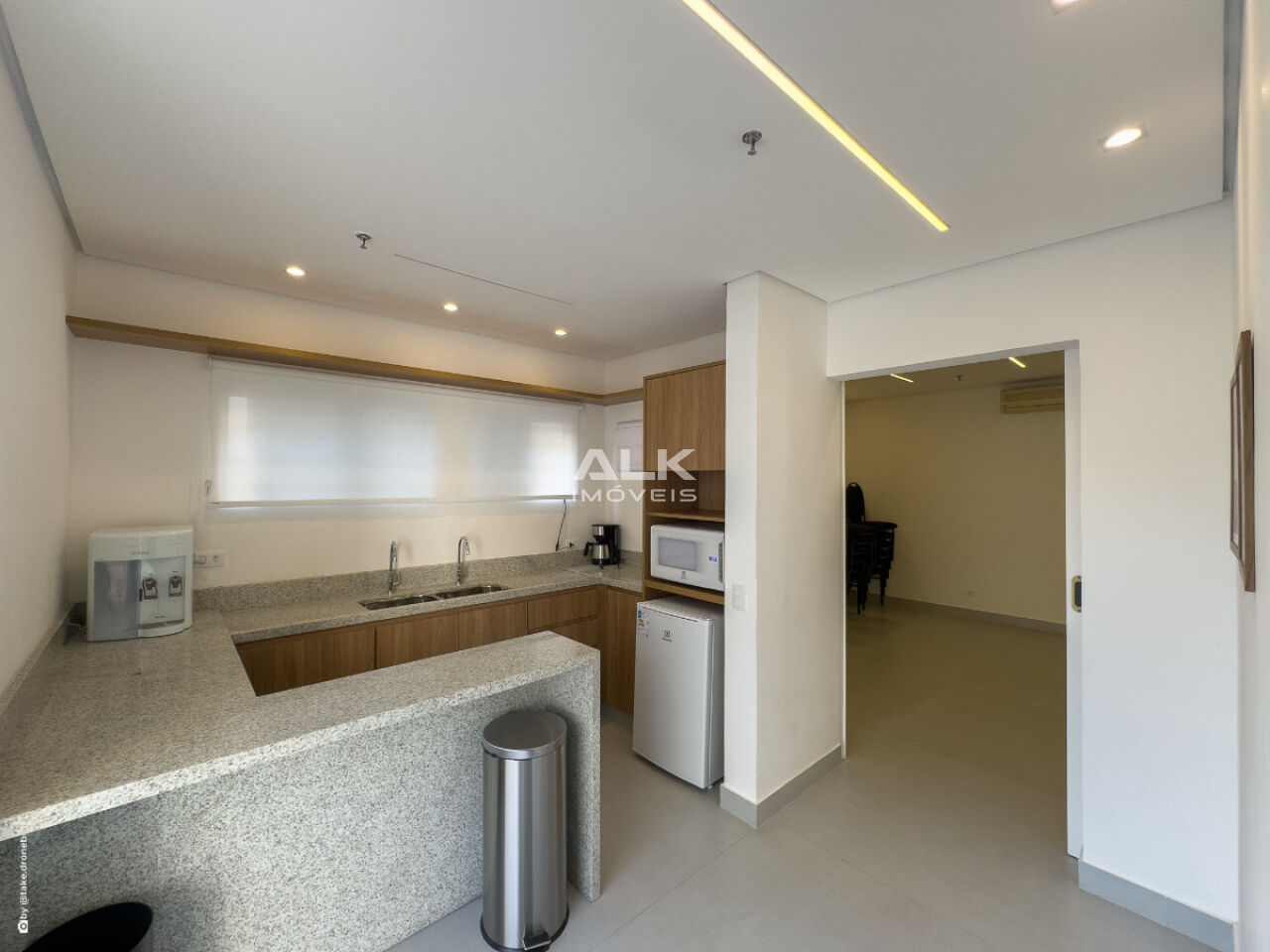 Copa e dois banheiros, piso elevado e forro modular, 2 vaga de garagem e com ar-condicionado em todos os ambientes.