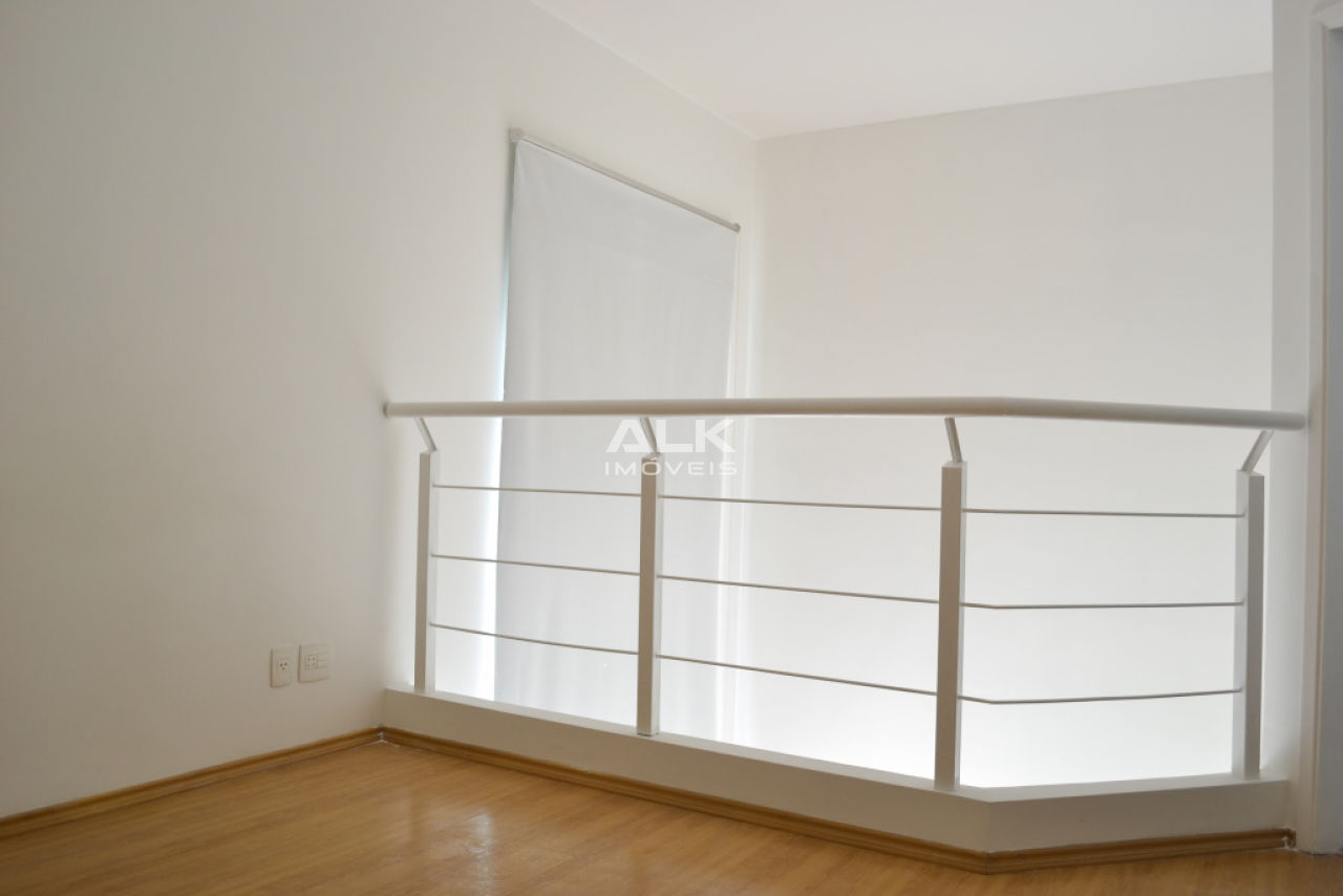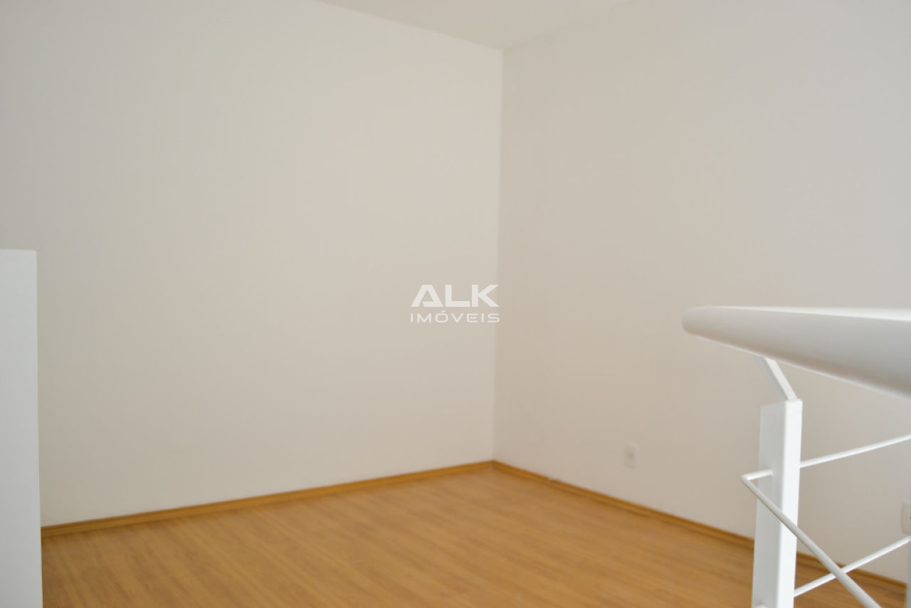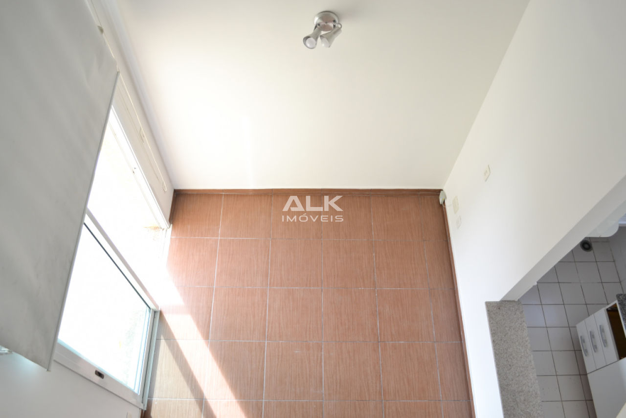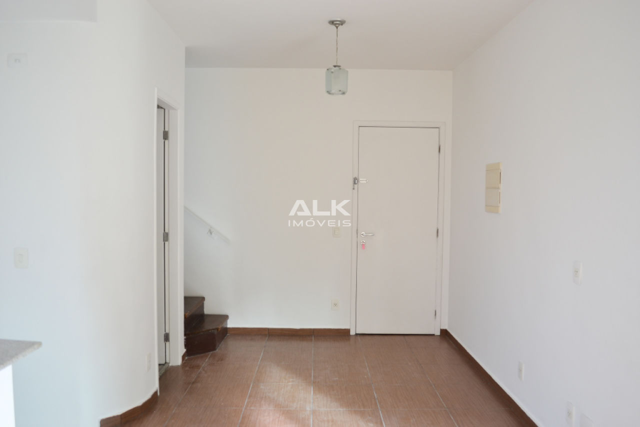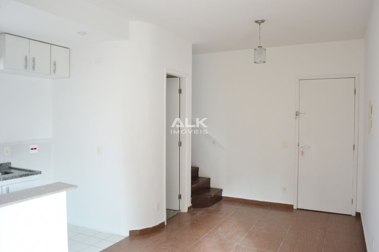Apartamento duplex 45m²: 1 sala com cozinha americana e área de serviço, 1 banheiro social, 1 dormitório (suíte) e 1 varanda. 1 vaga garagem. Pintura nova.